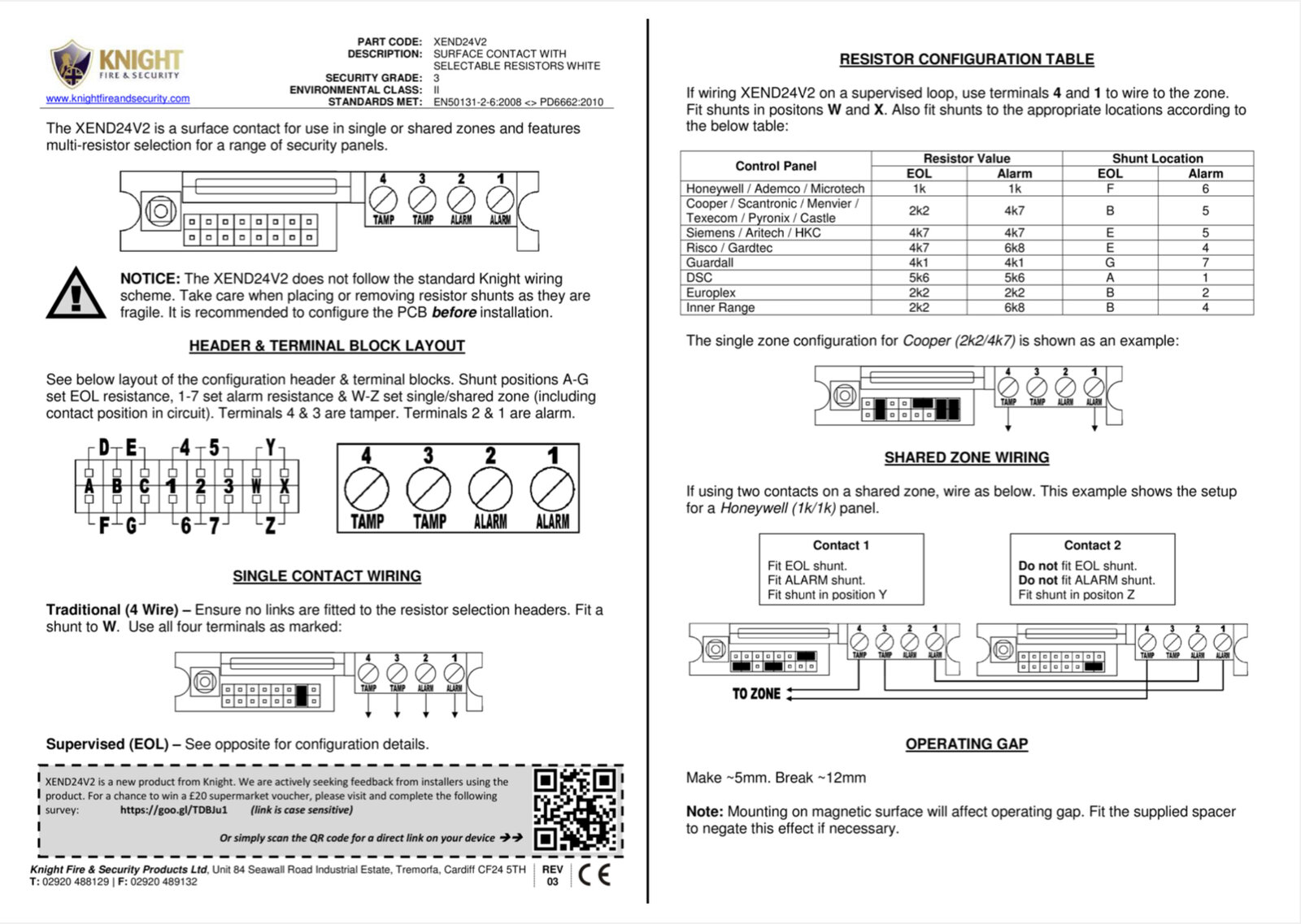 I've checked the wiring at the panel and the contact and all looks okay. I've removed the magnet from the door and presented it to the contact sensor and can hear the switch detecting the magnet's presence. The door contacts are identical Knight XEND24V2 units wired and with jumpers/shunts installed as per 2k2/4k7 as documented for Texecom systems.