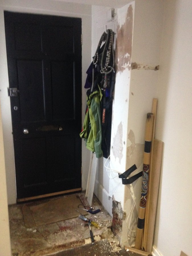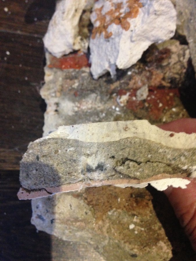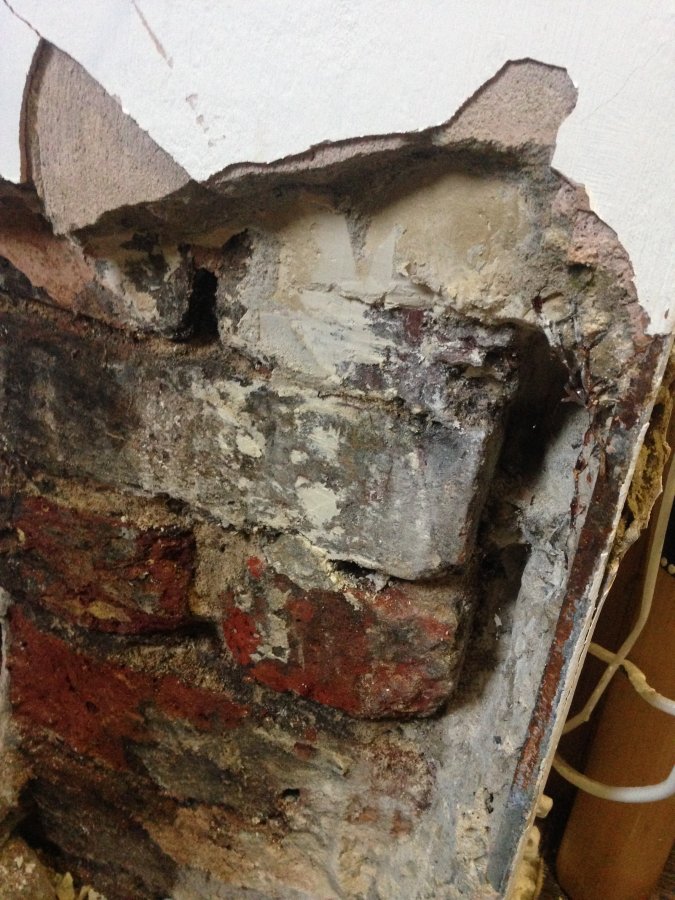 However still have damp problems at the base of one of the door frame pillars. Having hacked away at the base, it appears that some form of fine filler (up to 2cm thick in places) has been used on the brick prior to cement and finally plaster. The cement is dry but the filler is like half dried cottage cheese!
