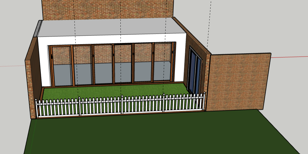 In the SketchUp the White building is the (start of) the extension, and the fake grass is between that and the white picket.