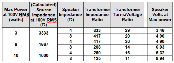 Once one knows the source voltage at a particular maximum power, it is arithmetically trivial to determine what source impedance it equates to, and hence what impedance ratio (hence also turns/voltage ratio) is required to 'match' the source impedance to any given speaker impedance.