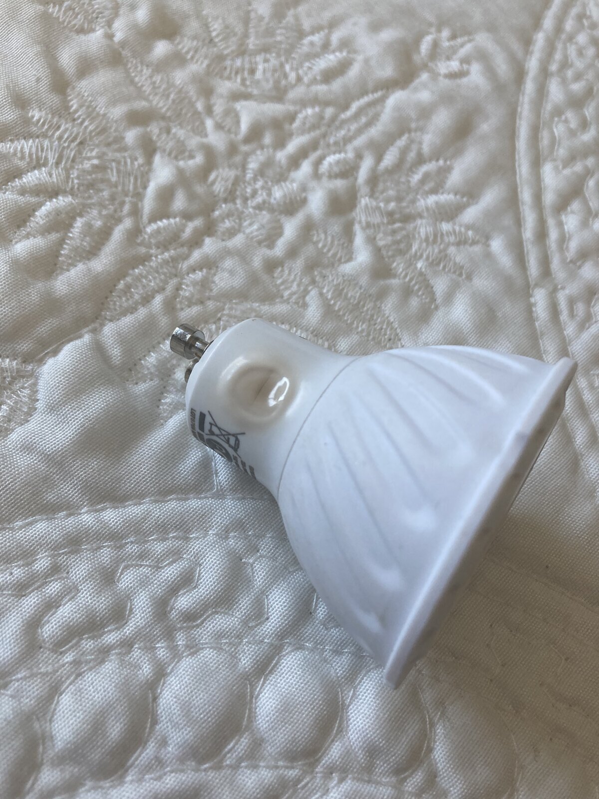 We recently moved in to a new house which has recessed lights in a built in wardrobe that don’t seem to work. I went to replace the bulbs and noticed that one of them seemed to have some sort of thermal damage on the outside. Any ideas what may have caused this? Bit worried about fitting new bulbs if there’s potentially an issue…