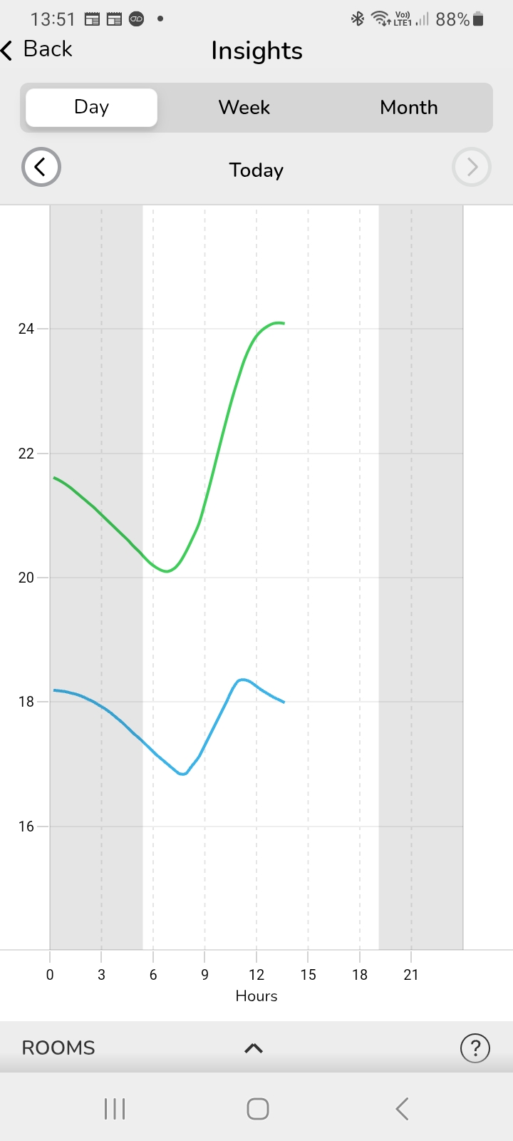 showing two rooms with Wiser thermostats, and how the temperature has been, boiler not running today, but not found anything like this