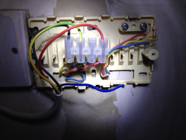 You then have what I assume is 1 cable coming from wall behind the box which is connected to the bottom of the joint box. This has yellow, earth, blue and red connected.
