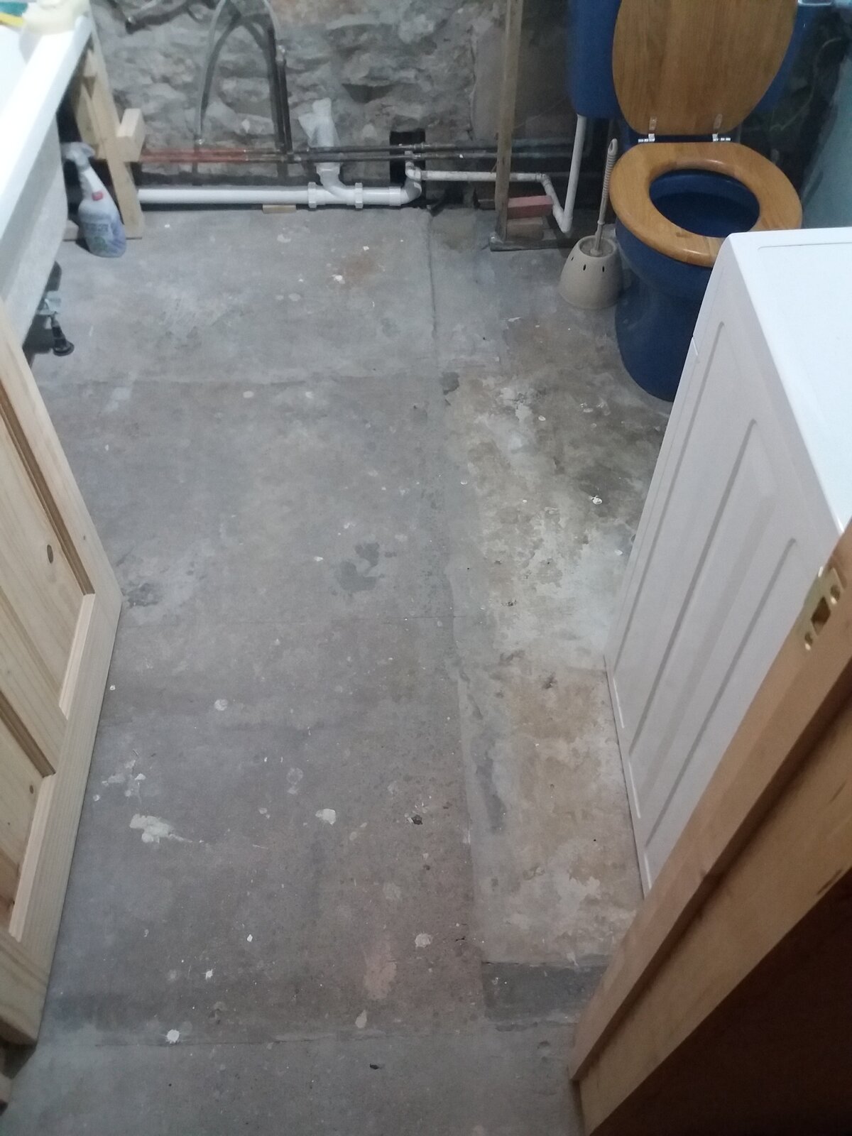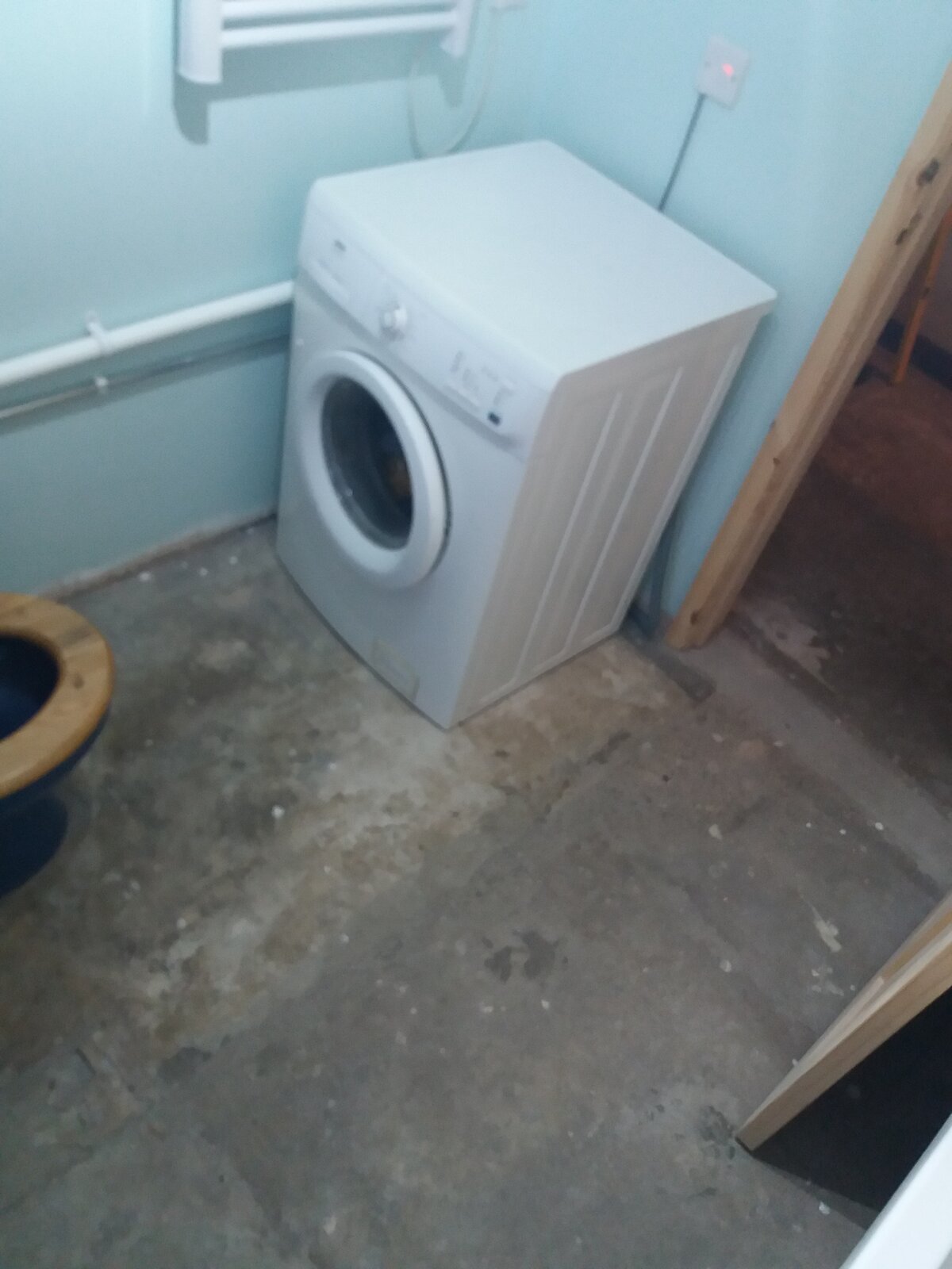 1900x1700 area. Probably a wet room with adjacent privy before wall came down to accommodate bath (which was below central heating boiler..). Refit inc. getting it back to regs. Also, washing machine now downstairs in bathroom.