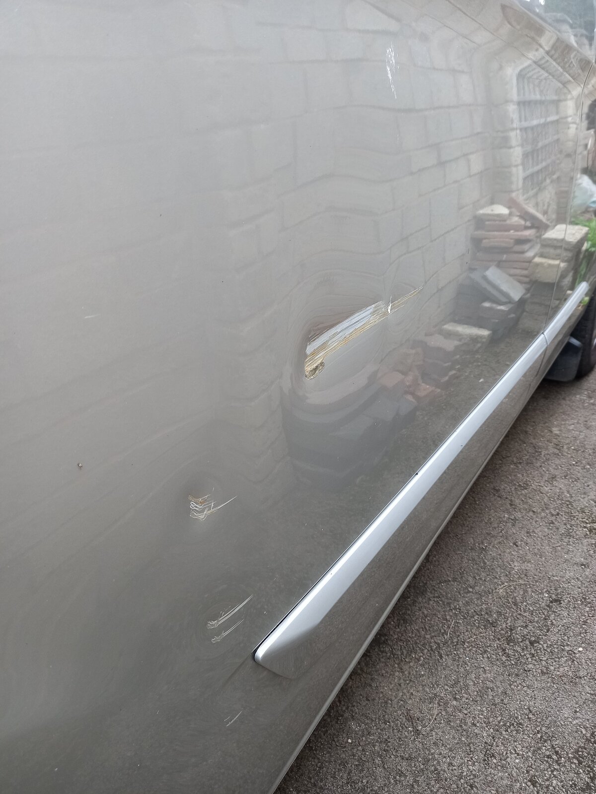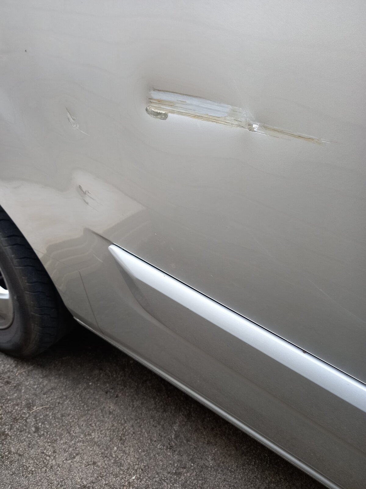 Blinded by lights in the darkness, I took the turn into our driveway too tightly and gouged a scrape into the side of my van. Luckily, it has not gone all the way through but it's pretty deep and rather unsightly.