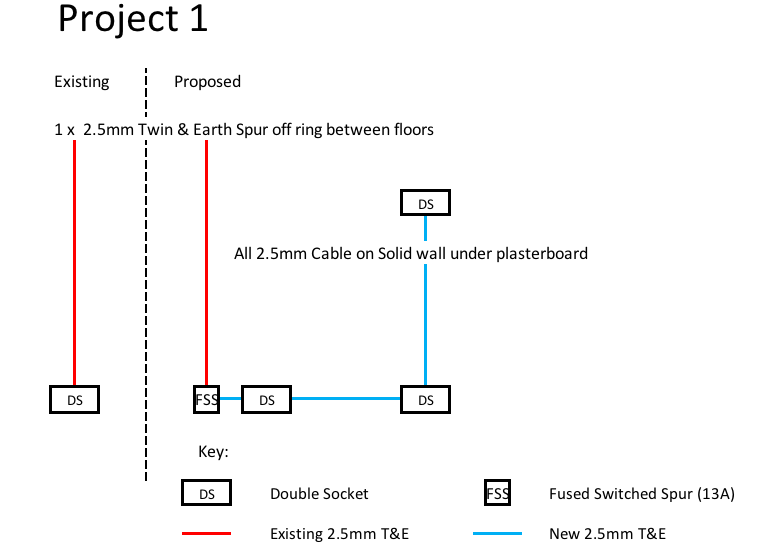 1. Adding sockets to an existing spur from the ring - I know is against the regs, what I'm suggesting is to replace the existing spur socket with a switched fused unit (13A) and then run three double sockets in series (two at low level, one at high level). i realise total load for all three sockets is limited to 13A - see attached Project 1 diagram