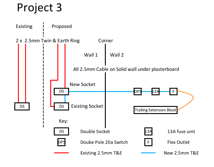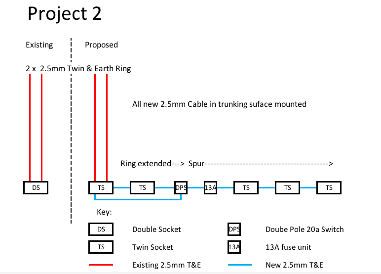 2. My Home-Office is away from the house, on side of garage, fed from main house consumer unit to its own consumer unit with breakers in the office. There is a 30A ring circuit, currently with 5 double sockets (two in garage), My problem is that with 3 LED monitors, up to 4 laptops, internet router, satellite box and beer fridge, I'm currently daisy chaining extension leads off one double socket! I want to add 4 x double sockets - See Project 2 diagram