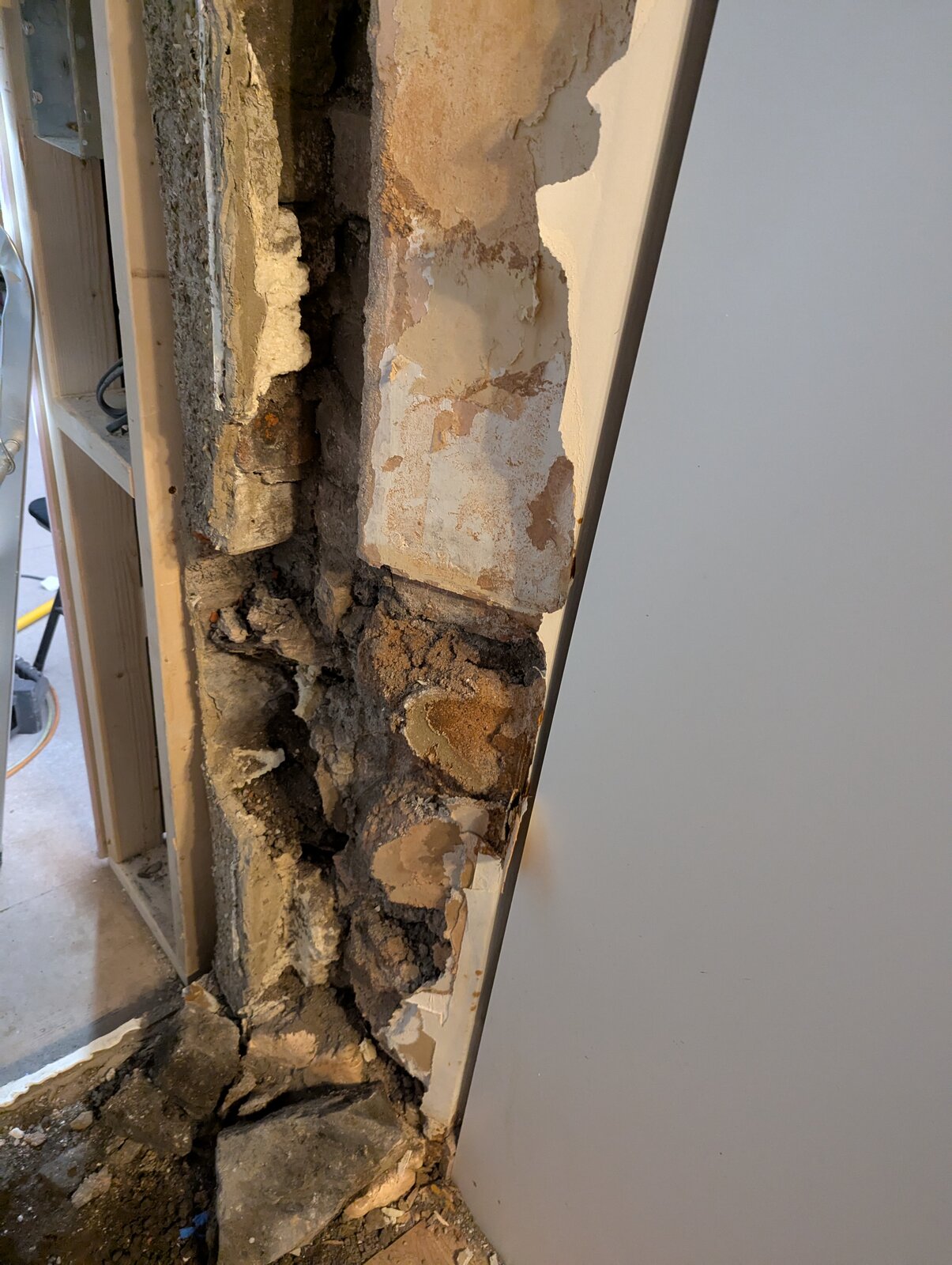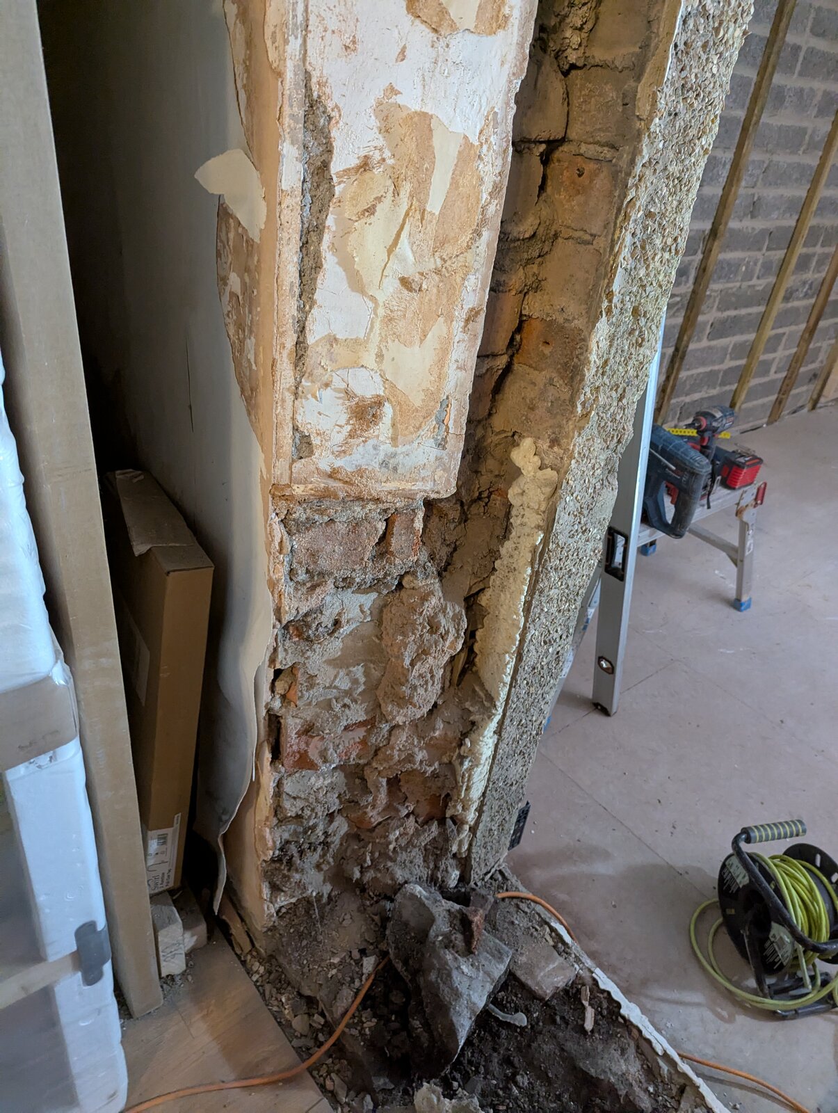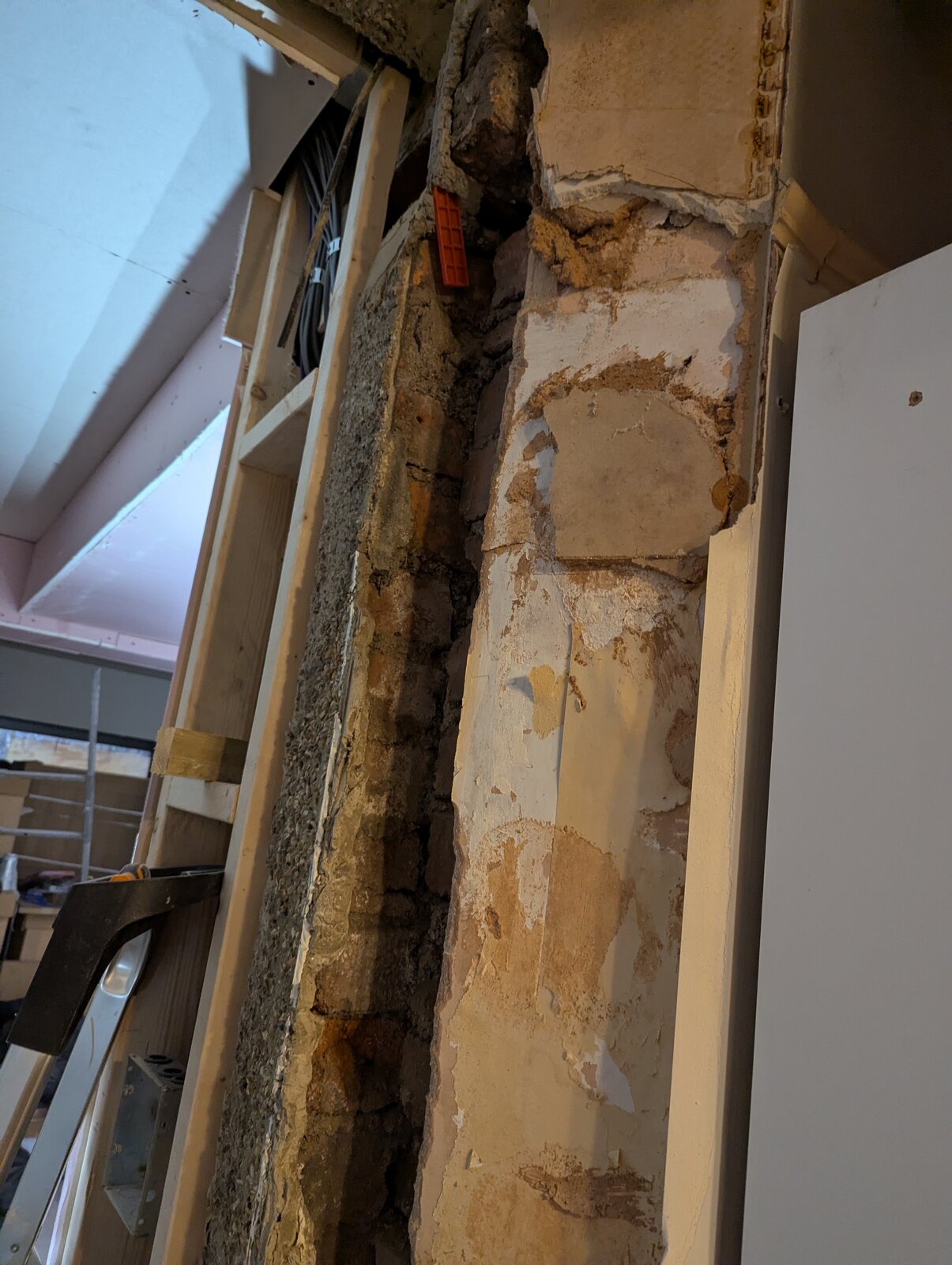 The other challenge is that this area has been notoriously problematic with damp due to being a solid brick wall, to the point where although I'd only replaced the plasterboard a few years ago, it was crumbling off when I pulled it off...