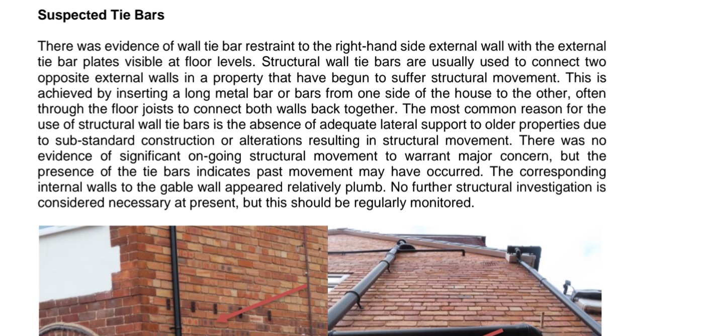 I was only asked about subsidence, heave and landslip by my insurer, so I was able to answer no to those as none of those have been a concern. My surveyor's comments on the tie bars in the report are attached. I've read it's common for houses to have tie bars in areas that may have been bombed during the war etc. The odd thing is I can't see any tie bars on my street (hundreds of identical 1930s properties) other than my house and the adjoining semi. As there's no suggestion of current movement, am I worrying over nothing?