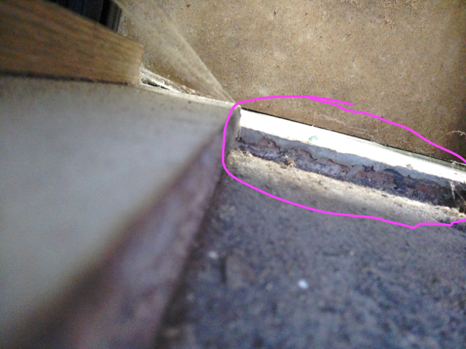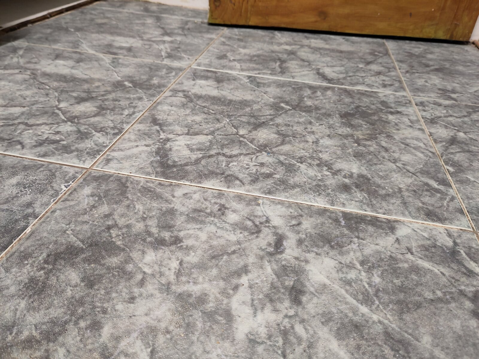 I'm afraid it's really hard to tell with the kitchen still in place. I can't even tell if the asbestos tiles are really there, though the asbestos survey says they are. I have attached some photos, one of the floor tiles and two from under the units. I hope you can make out anything underneath all that dust! The units are standing on white chipboard. In one photo I have circled the side view of the floor tiles. The brown bit above is the inside of the kick board. (Between the kick board and the tiles there's just a lot of light coming through from the kitchen.)
