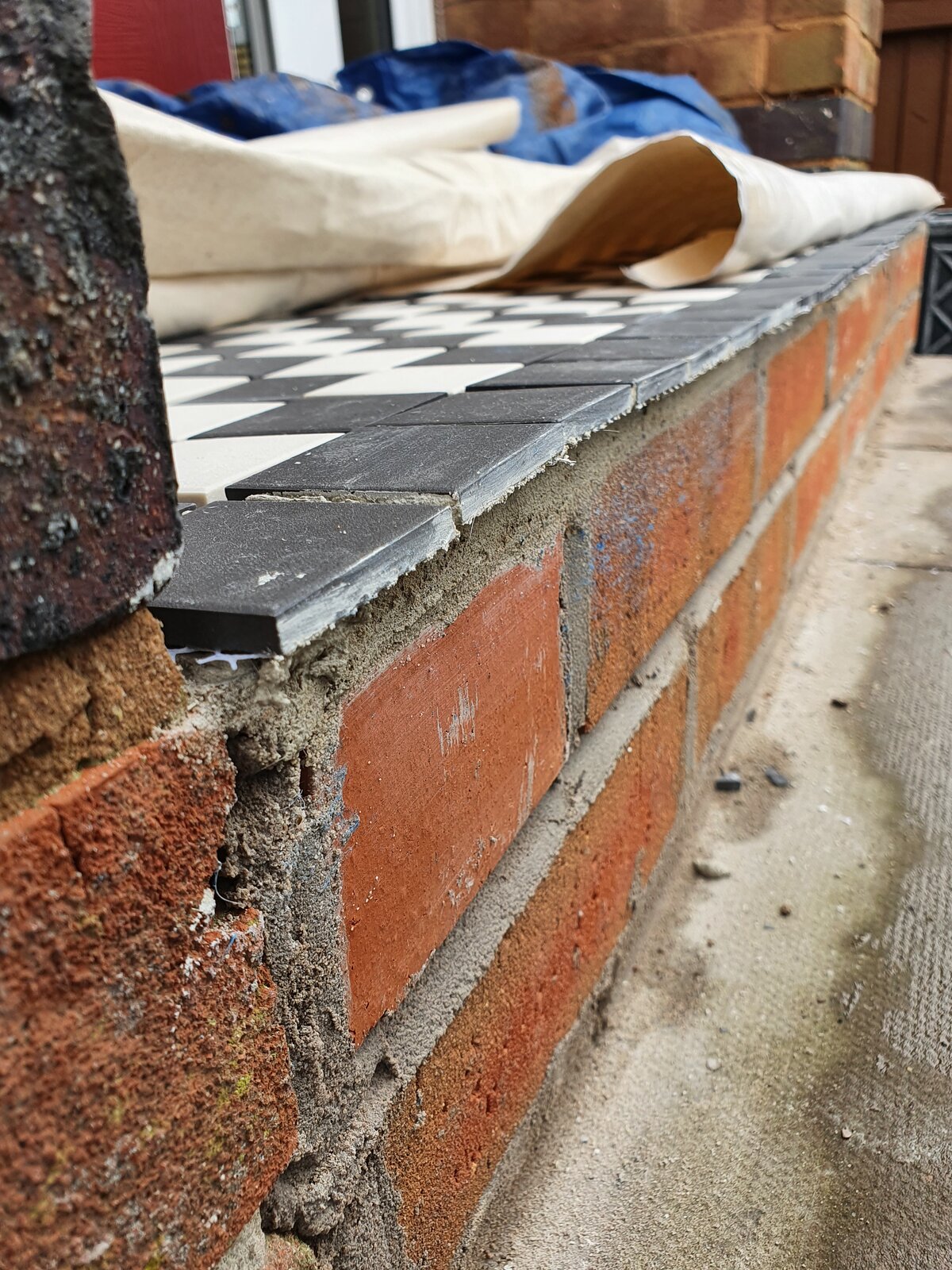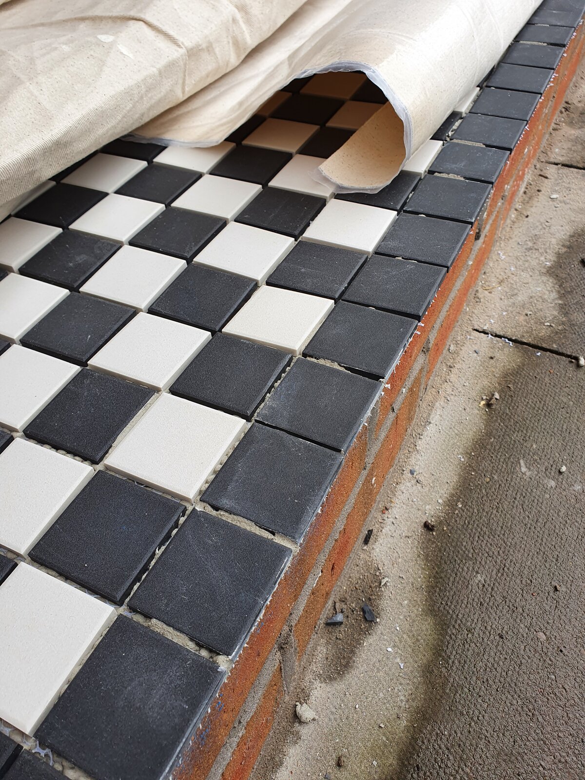 We're having victorian chequered tiles added to our front door step currently. All the tiles are down and they're yet to be grouted.