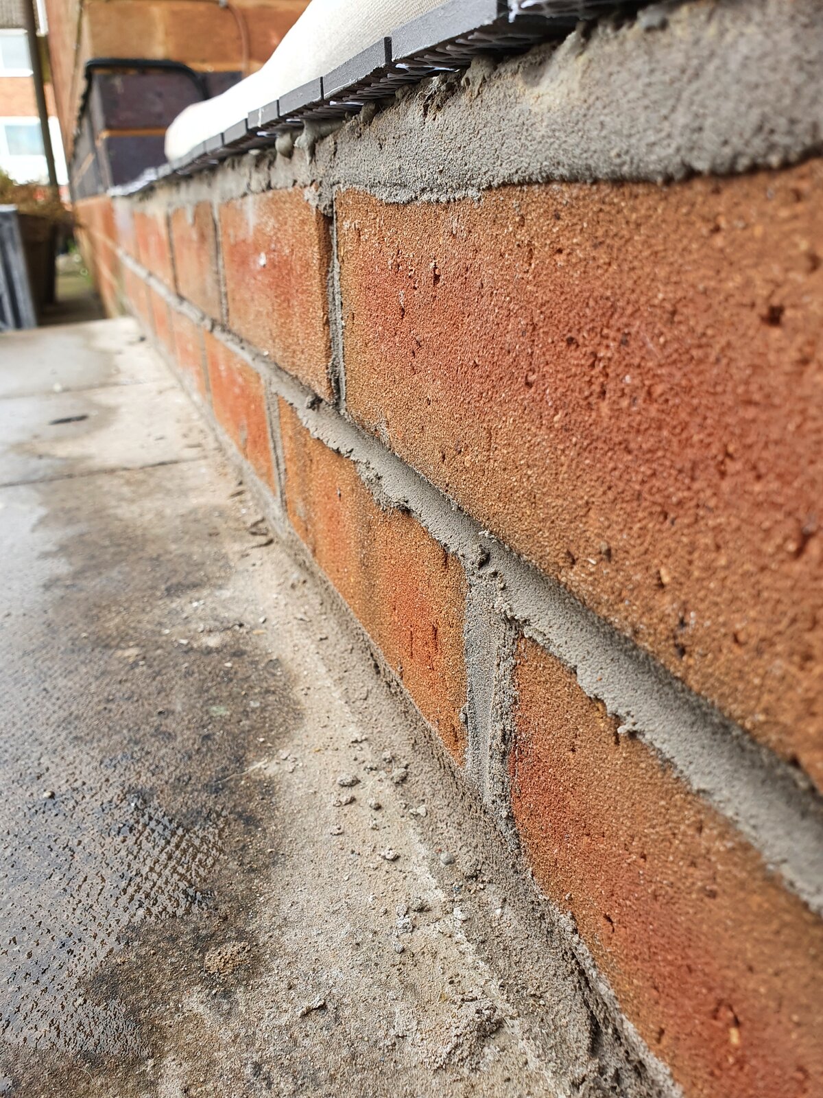 The guy doing the job for us has mentioned he's left a bit of an overhang across the edge of the step. I'd say its about half a centimetre in total, he's mentioned that when he does the grouting he'll lead some tile adhesive from the mortar of the bricks below to give it support.