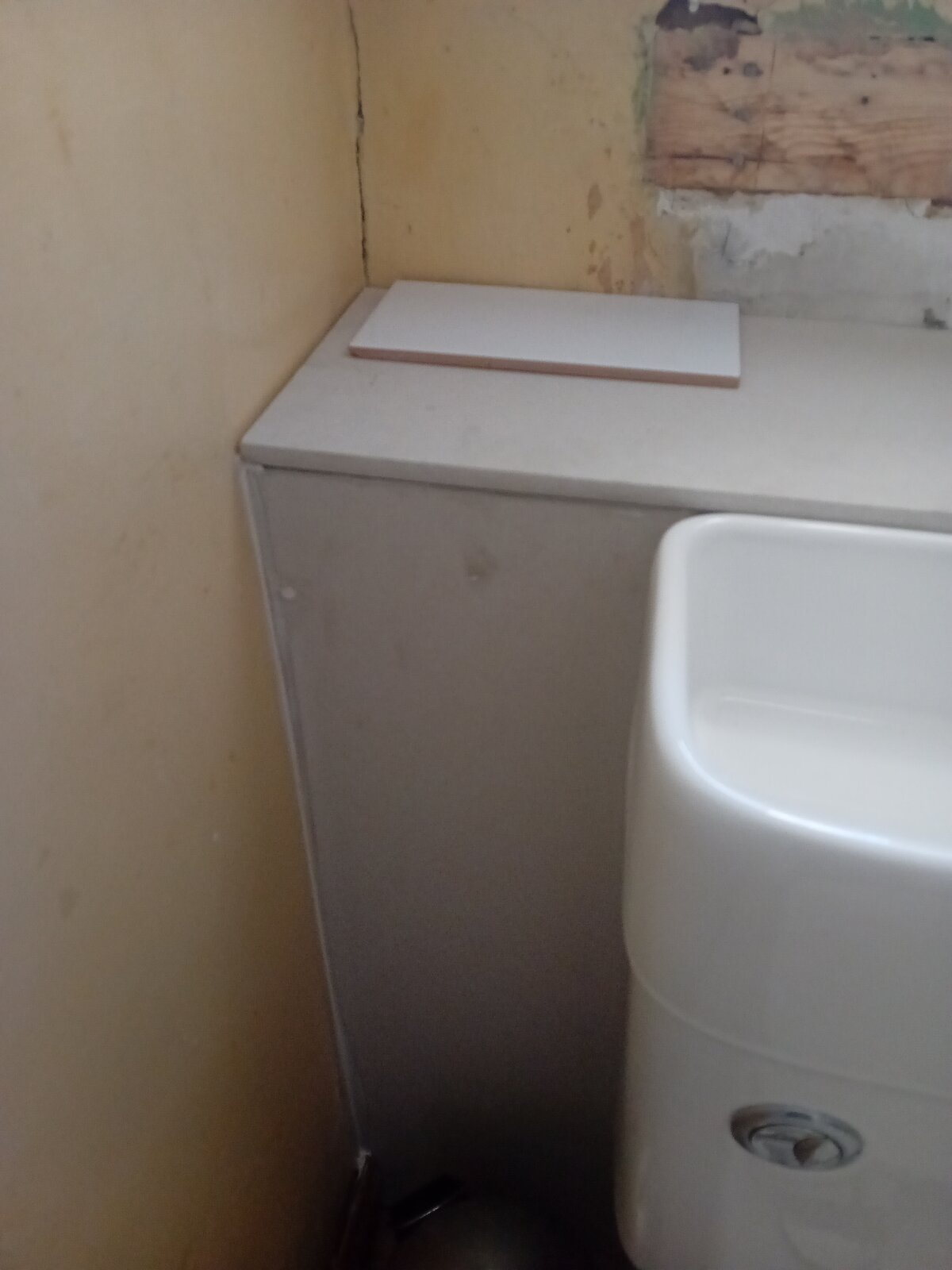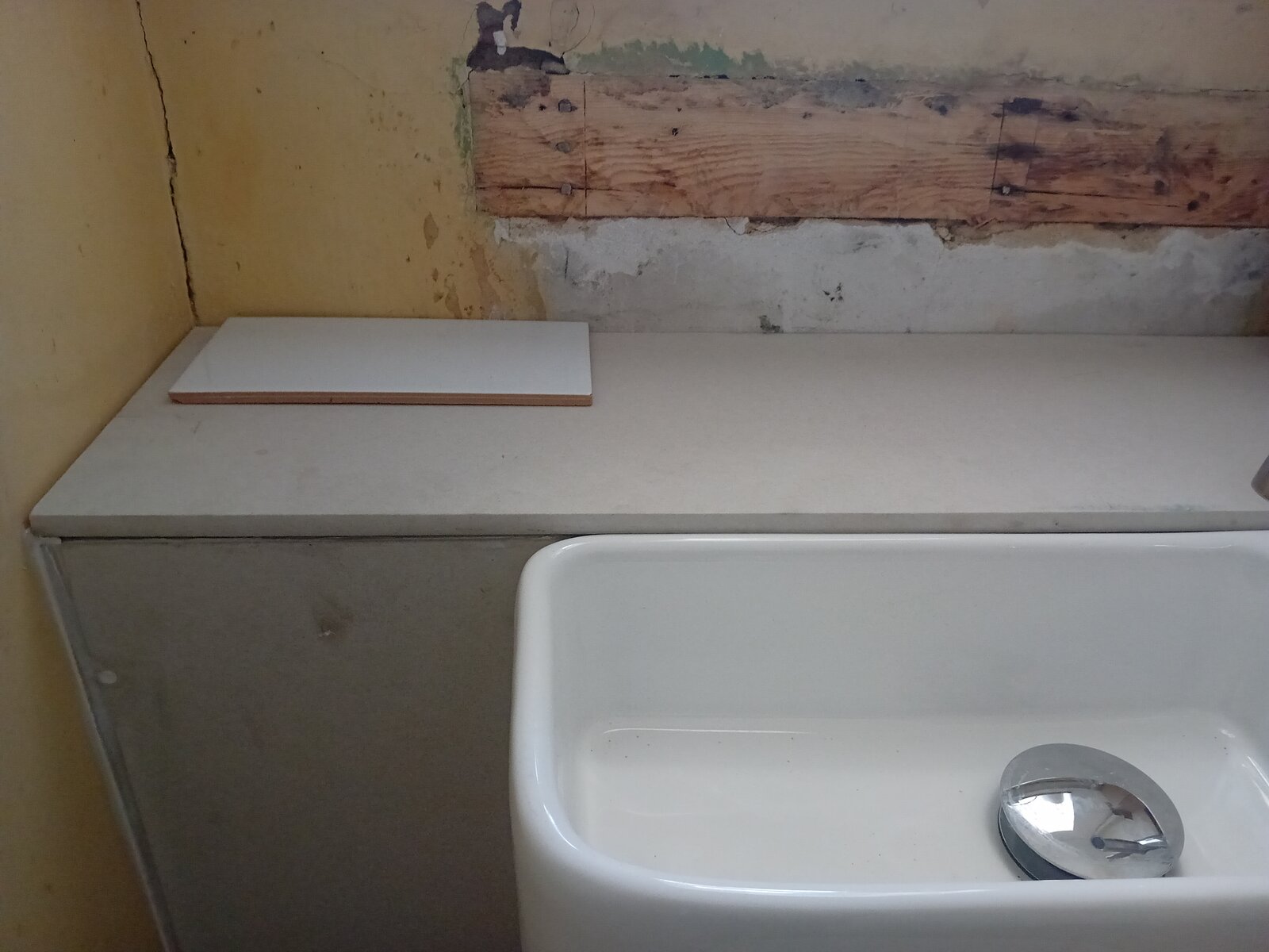 Please can anyone suggest how I can tile this plasterboard area behind the new toilet/ sink combo. Had to have this built to hide pipework, but not sure how to tile it as top of area is removable and needs to remain so to allow access to pipes.