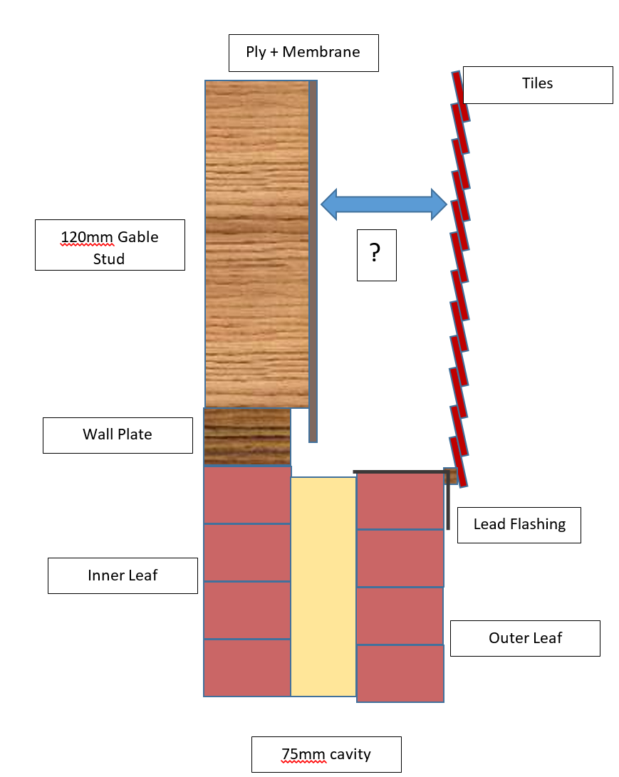 I'm using 120mm timber for the studwork. This leaves some 150mm gap from the finished gable face, across the cavity & external leaf to tiles.