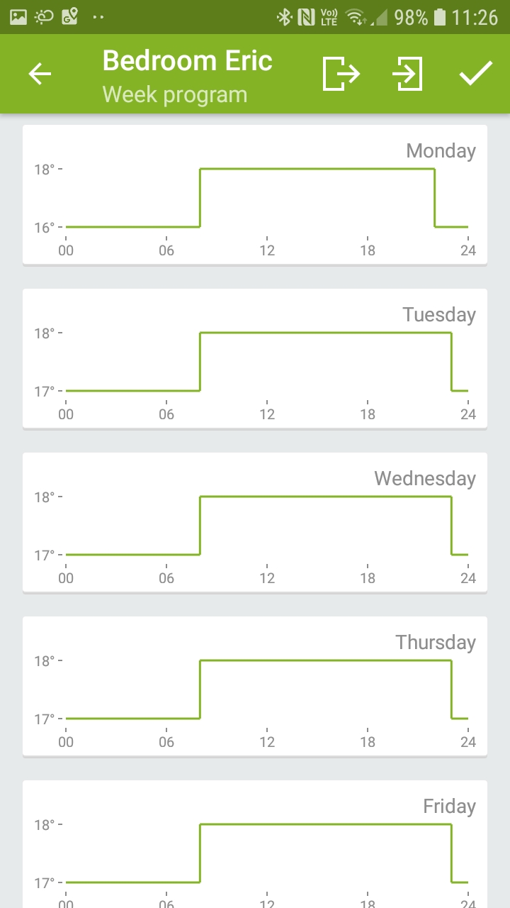 There is a huge difference in what I can do with each TRV head this Screenshot_20190725-112626_calor BT.jpg is the schedule for the eQ-3, but the energenie has many more options the base screen Over_all_report.jpg even more now this is an old screen shot, in theory using IFTTT I should be able to link the TRV current temperature to the plug in switch/monitor which in summer controls my portable AC so should be able to auto start/stop the AC unit depending on room temperature, however the AC in the two years we have lived here has only ran for around 5 weeks, so hardly worth automating, I just look at room temperature before returning home and it temperature high I manually turn it on.
