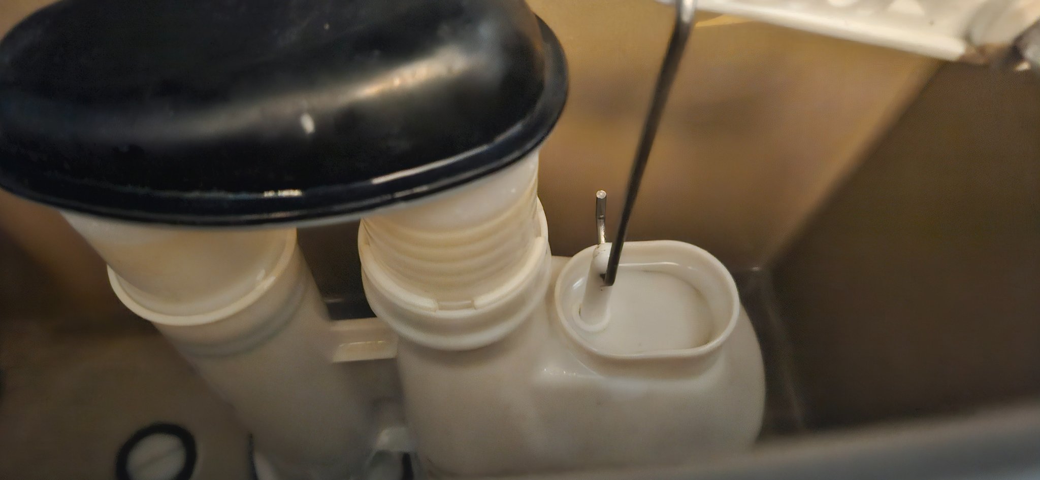 Now, not only does the piston stick (most of the time) but when the lever is fully down the handle is level. But as the water level goes up so doe the piston, which has the effect of dropping down the handle.