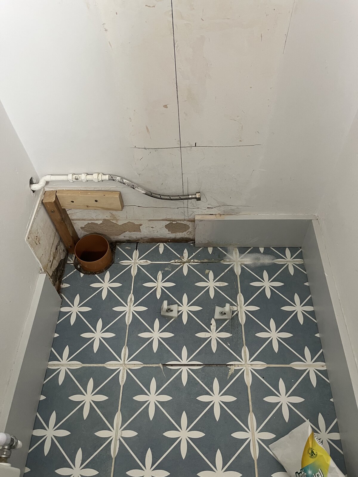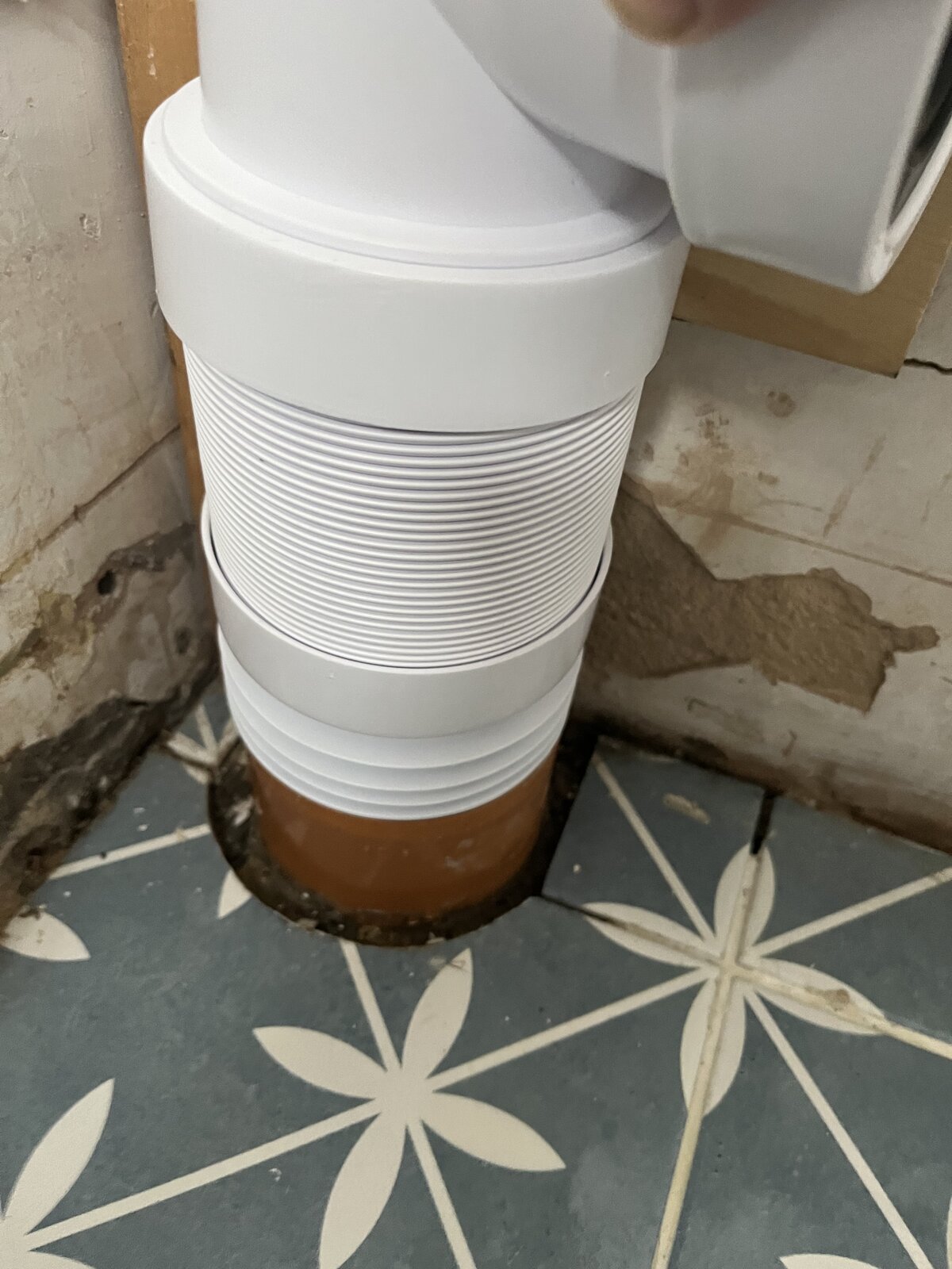 Wanted to replace with a flexi 90 degree pipe, so only 1 connection to soil and 1 to the pan. However, soil waste outlet is 100mm, and can only find 110mm products.