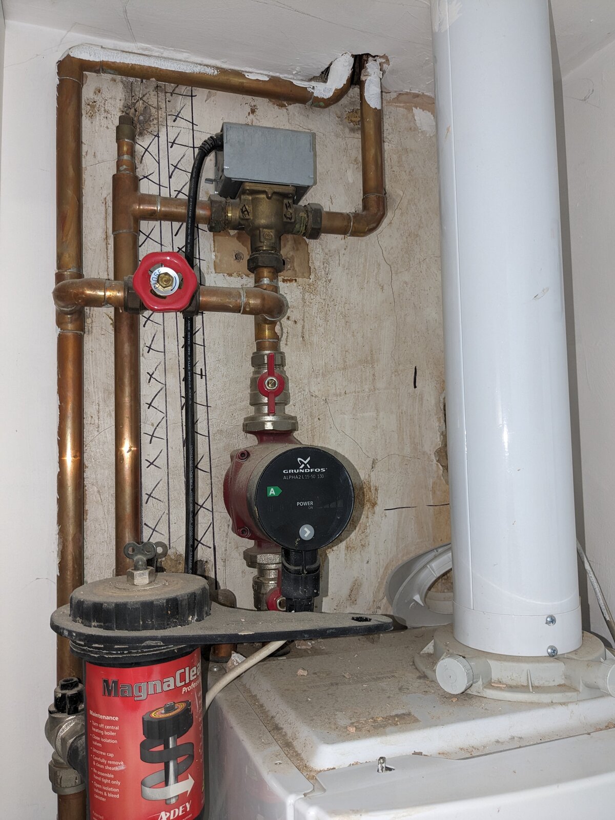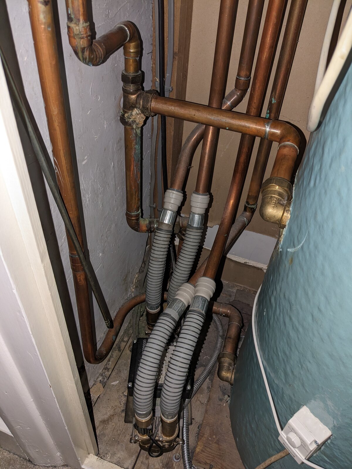Tank - left pipes don't have any stop valves. Right pipes at top (hot - hot tap water right?) don't really have any valves either.