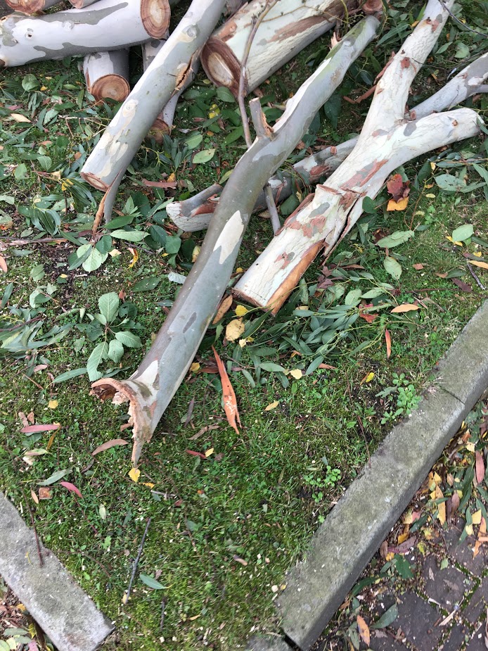 You've 4 trees there - the two at the back and the logs on the ground look like eucalyptus. The tree the logs are stacked against looks like a cherry, and the one on the right I can't see well enough to take a guess.