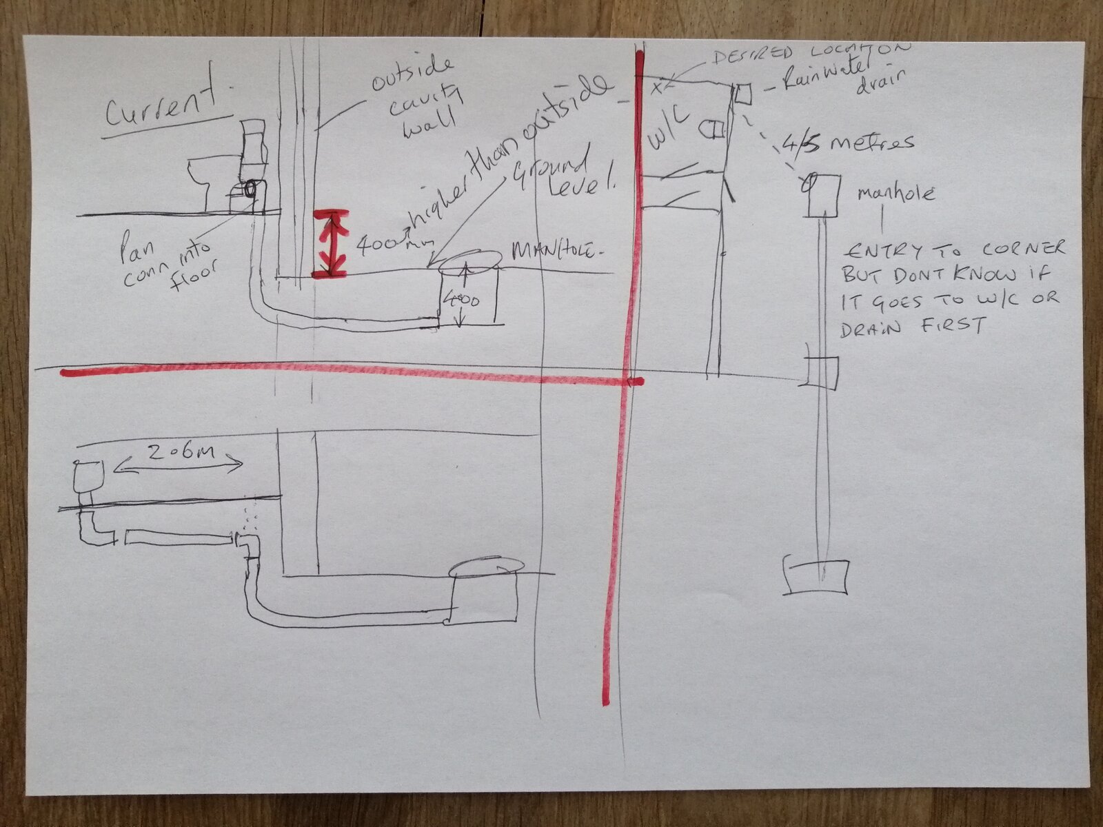 This floor is about 40cm above the outside ground level, and the soil pipe about 40cm (to top of horizontal pipe) below ground (i dug a hole to locate it).