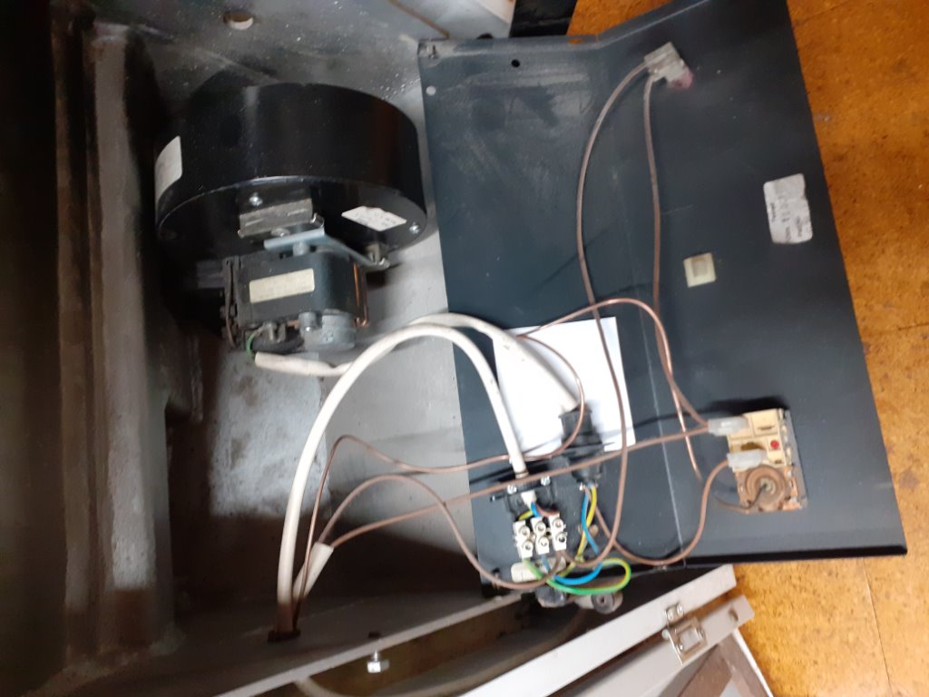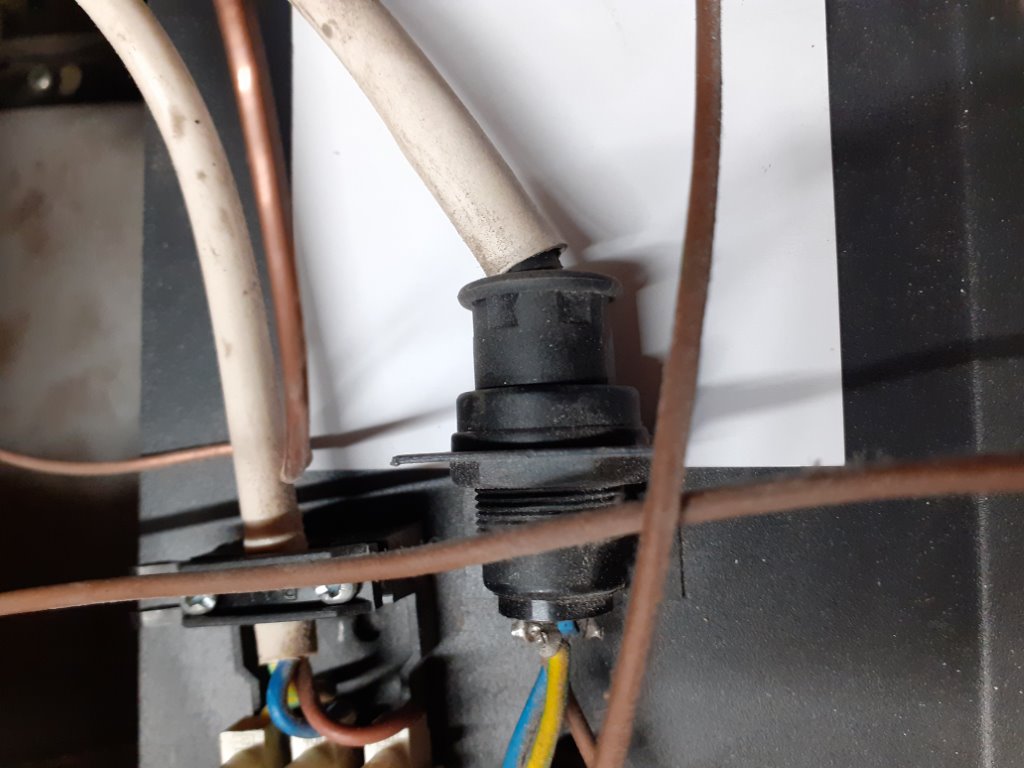The thick power cable from fan goes into something that looks like an old-style black plastic lampholder, anchored horizontally to the drop-down fascia that carries all the electrics; there's a black plastic collar that you can unscrew - just like a lampholder, in fact - but when that is undone, the cable from the fan is still wired into the base of the "lampholder" somehow; there's nothing like a plug-in connector that you can just pull apart - which is what I thought I remembered from before.
