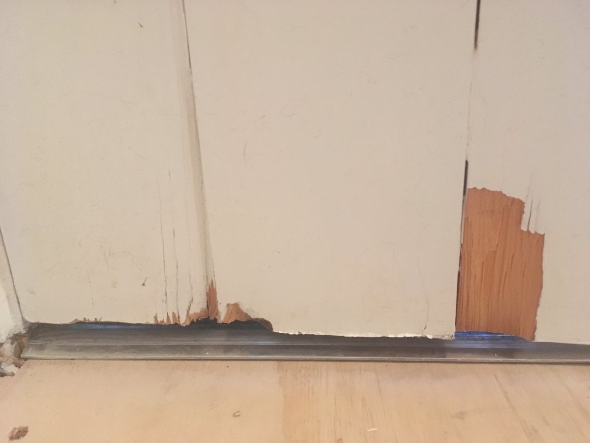 help! We had a new flooring fitted in our bathroom and the man who did it advised we would need to take the door off the hinges and sand some off the bottom so it would open properly. However my partner decided to leave the door in place and chisel off the bottom instead. The door now does open properly but has a terrible jagged edge and large pieces have splintered away. How can I fix this and what tools will I need? I don't want to have to take too much more off as there will be a big gap under the door. Thanks in advance