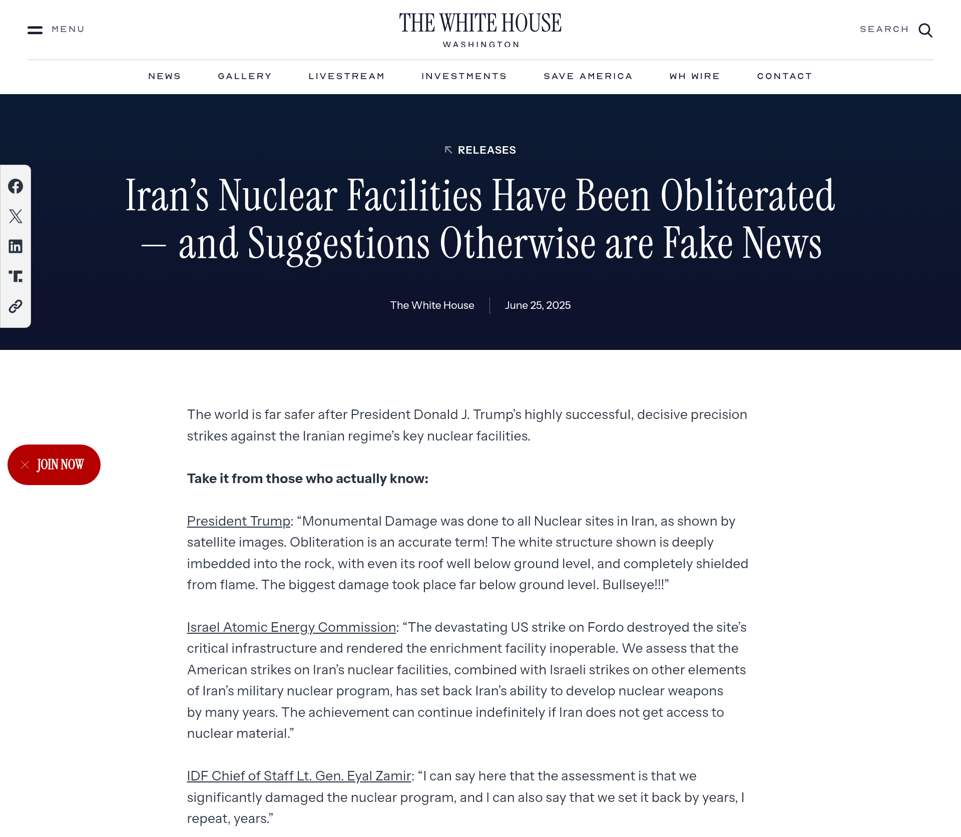 Even the White House still has a statement on its website, external dated 25 June 2025 under the headline 'Iran's Nuclear Facilities Have Been Obliterated – and Suggestions Otherwise are Fake News.'