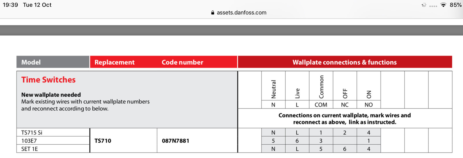 I ordered a TS710 to replace it, believing the backplate was a straight swap. It isn't. The 715 was wired N and L and 1(COM) and 4(NO) with an additional link from L to 1.