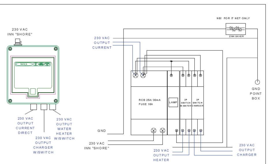BS7671 also requires the use of the blue plug and socket for the main supply to the boat, I am not sure about the RCD, poor name as easy to get recreational craft directive (RCD) and residual current device (RCD) mixed up. He fell foul of the RCD with his AGA stove, and I could see no problem with it, and the use of the diodes in the earth I know are required, but it goes against the grain. The idea is you can have 1.2 volts before any earth current flows, so it does not damage the hull, I see you have it fitted