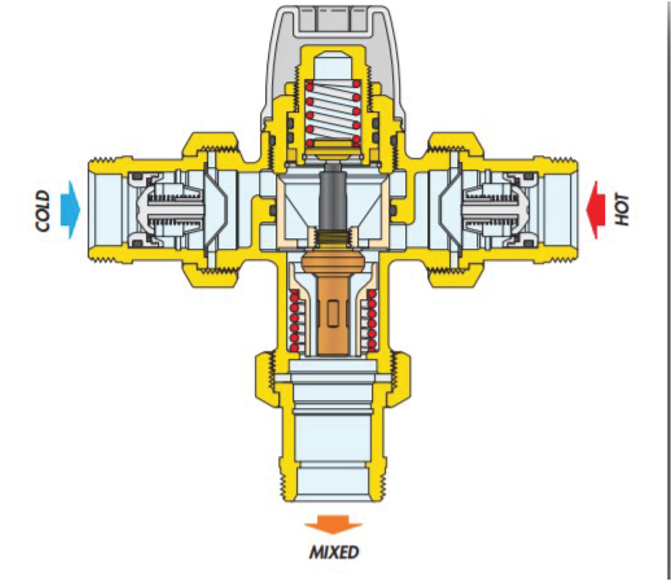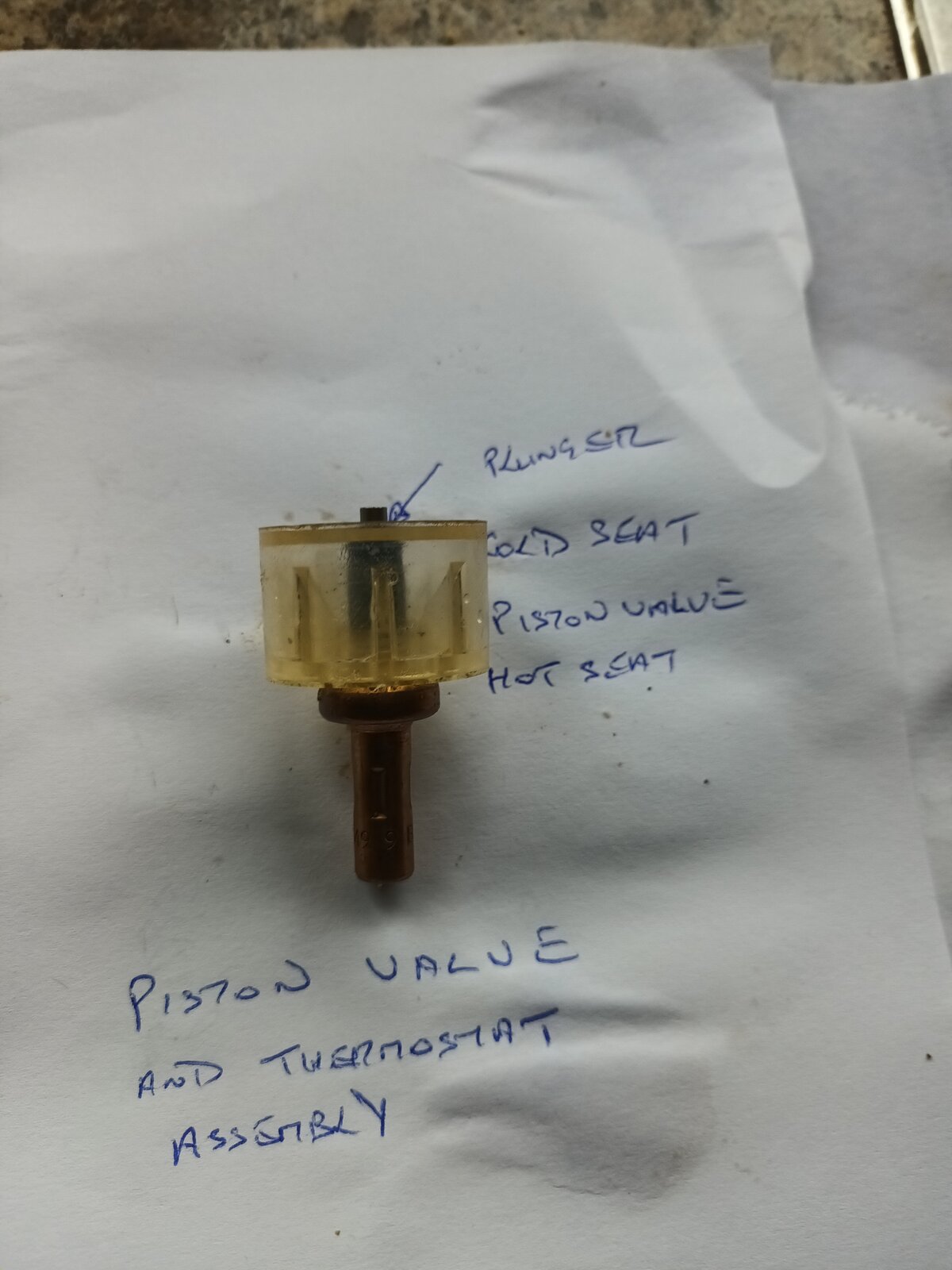 I hadn't fully understood how the thermostat operates but can see now that as it heats up the plunger in the top is (hydraulically) forced up against the adjusting screw which forces the piston valve downwards to allow cold water to mix with the hot or shut the hot off completely if required, say in the event of cold water supply failure.