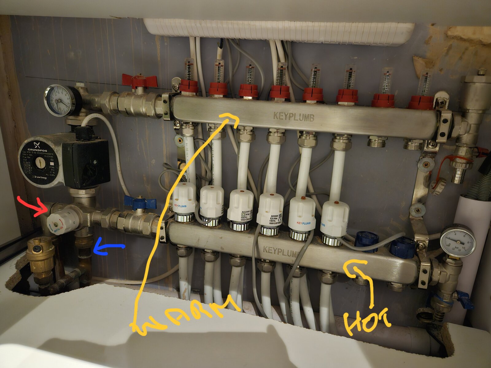 I notice pipes connected to blue are hot and pipes in red are warm so not sure if engineer has connected pipes properly. I am also not sure on the pressure of each valve.