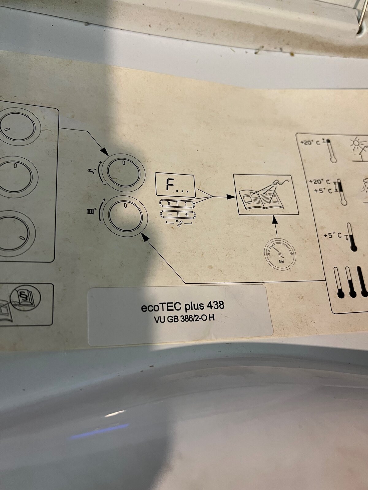 Attached are some photos of the labels shown on the boiler; one of them shows that it is a Vaillant ecoTEC plus 438 along with its serial number.