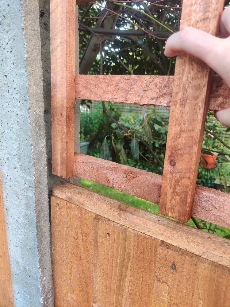 I'm no expert on these matters, but the whole thing just seems off. I saw our cat chase a squirrel about 10 minutes ago across the fence and the whole thing was just wobbling around (the trellis that is, though the cat is a little on the chunky side...).