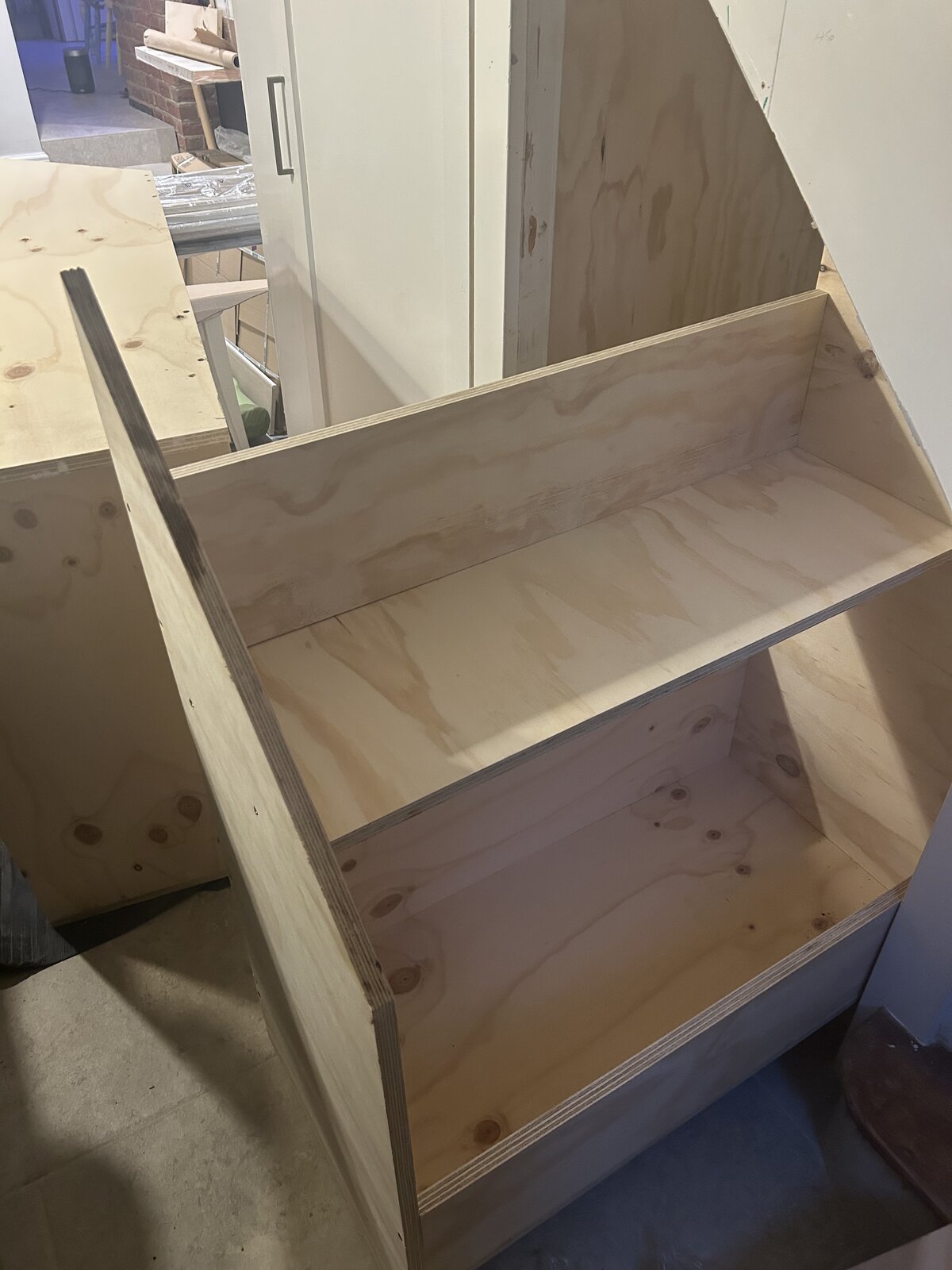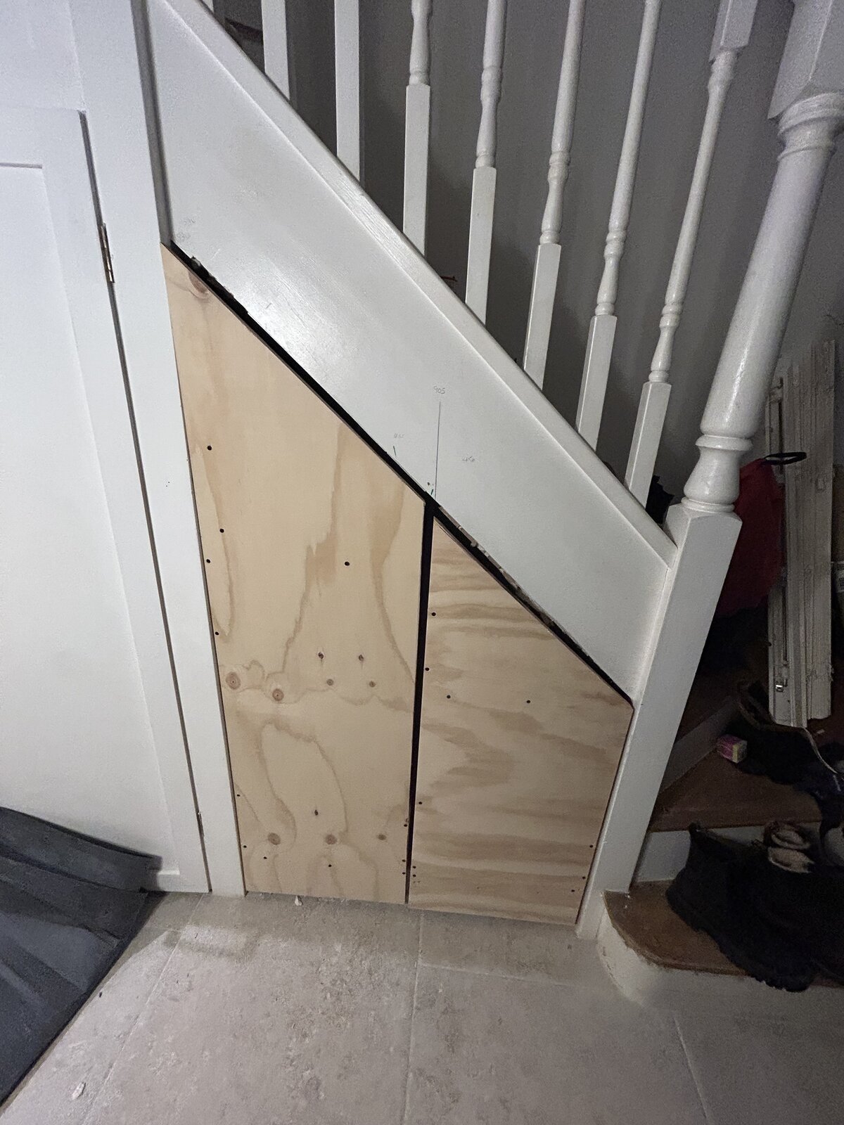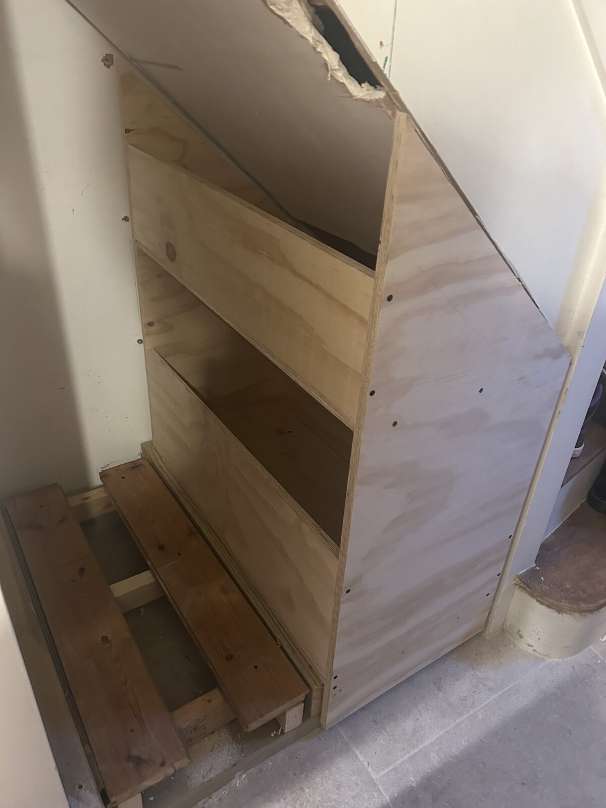I did plan to build this out by another 18mm with plywood on the current flat white bit above of the stairs so it’s not such a big gap but the bottom fits on the drawers and the top doesn’t.