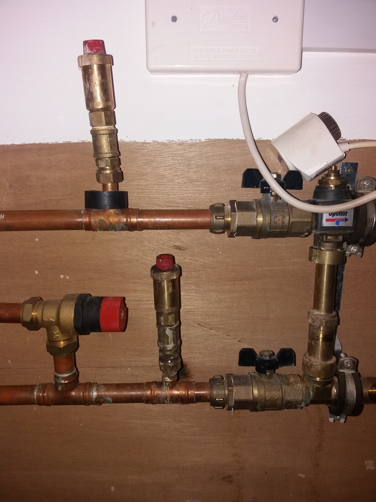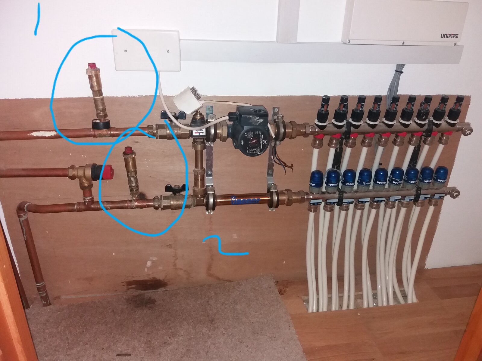 Hi hope someone can help me with some advice before I call someone out. We have Uponor underfloor heating with a pump upstairs & one downstairs. Each room has a separate thermostat to control heat. We have an oil boiler which keeps dropping pressure but is not locking out. Heating & hot water are working (touch wood!). The upstairs pump I have heard loud clanking noises from & when I look at the pipes as marked on the photo (1) is wet & the other (2) seems to be leaking quite a bit & the carpet is wet so could have been going on a while. Could this be the cause of the low pressure? Does anyone know what this part is & what it does? Thanks
