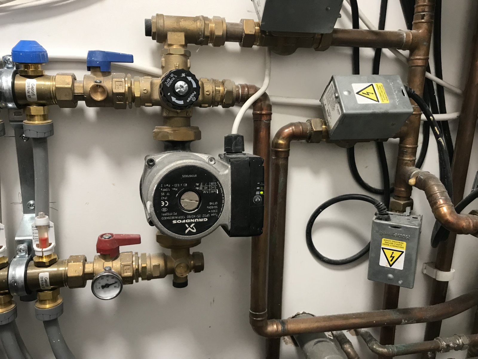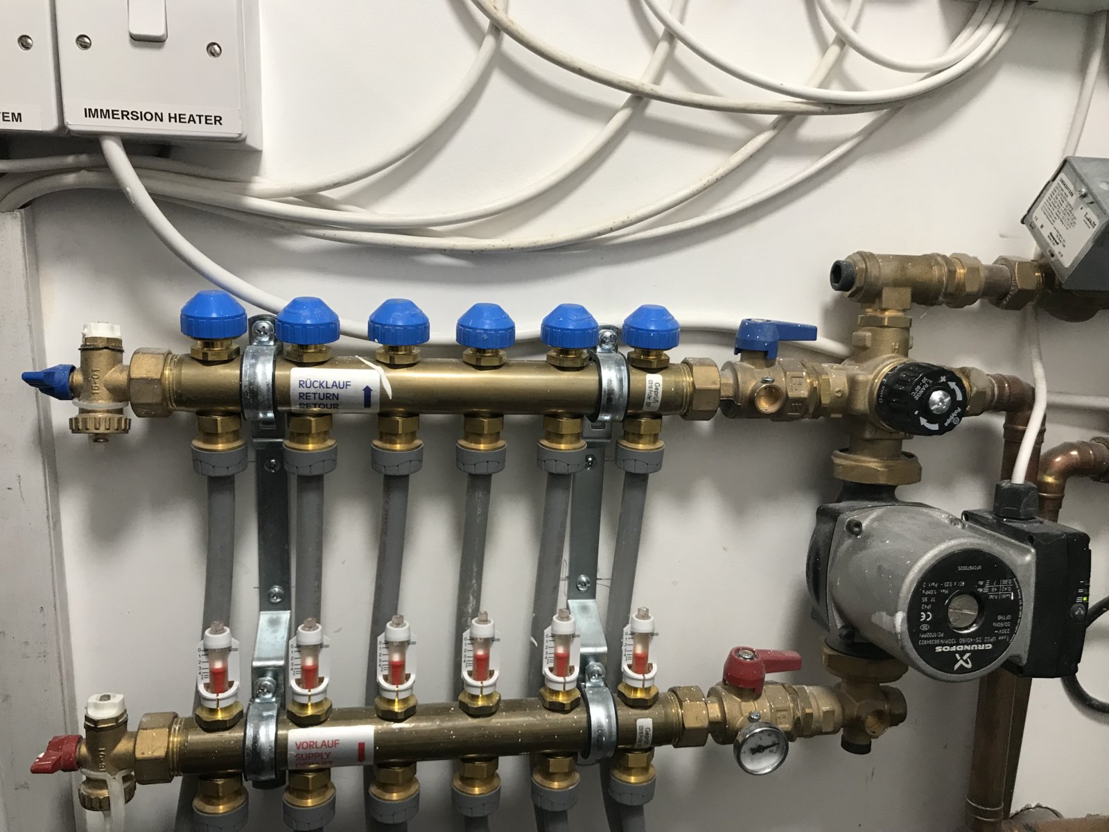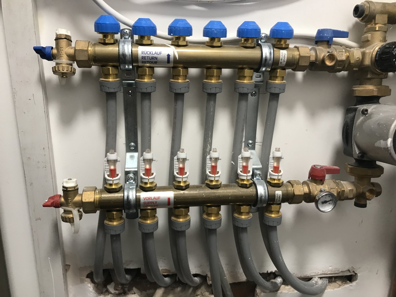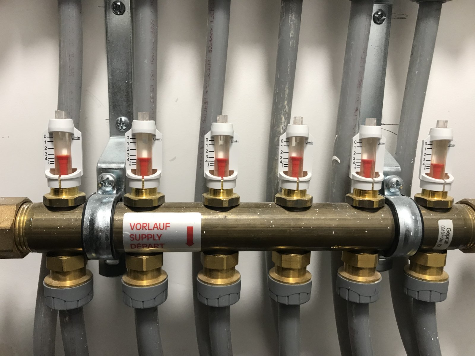 My UFH isn’t heating up my ground floor in any zone. It was yesterday but not today. The flow meters on the manifold are showing 3 l/min. The grey pipes on the supply and return are hot but the floor isn’t heating the slightest although the thermostat is ranked up to 23 degrees.