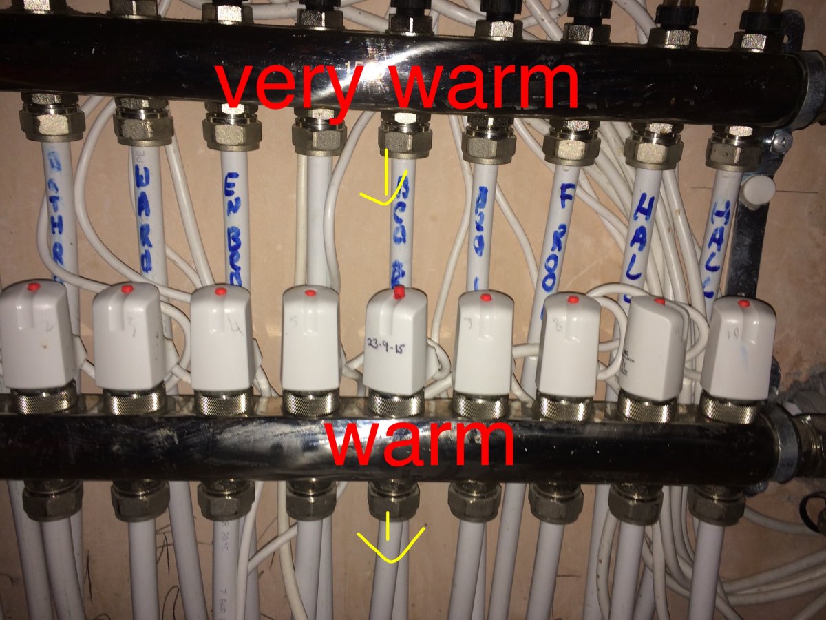 Not sure if this makes any difference. I switched all upstair zones off except the room not heating. As you can see actuator pin up. One pipe is hotter than other.