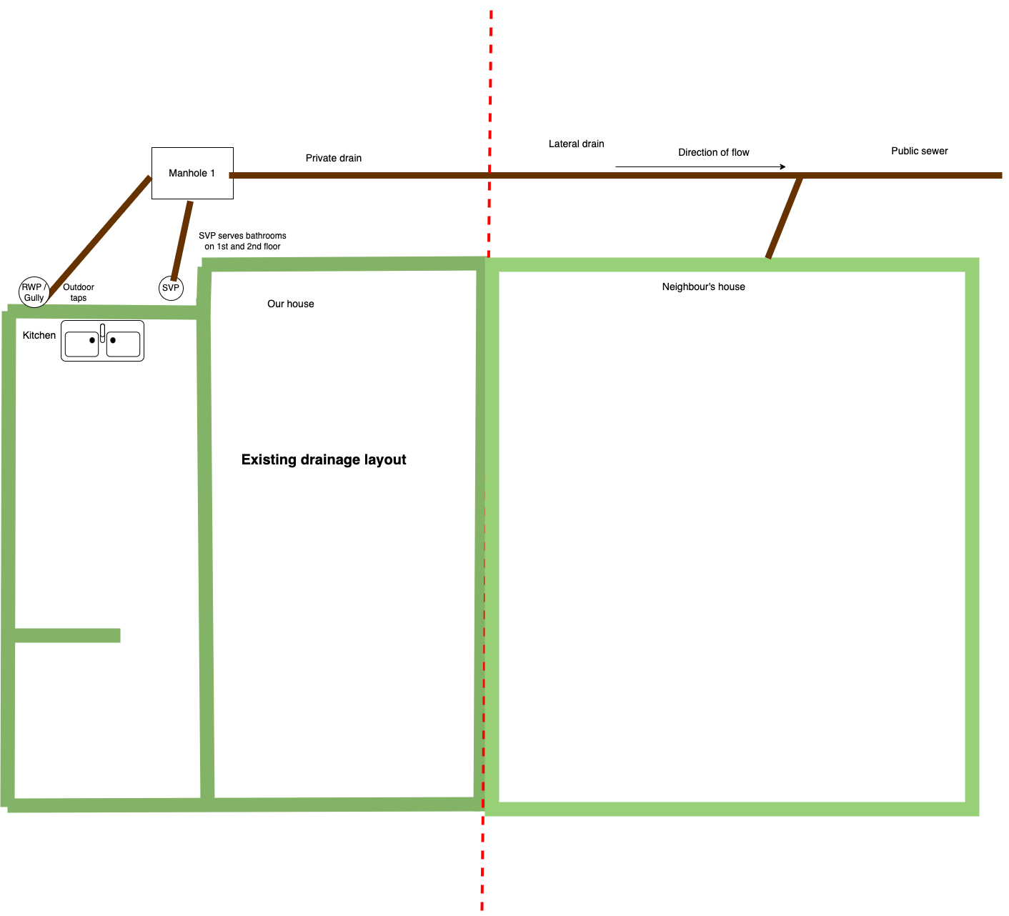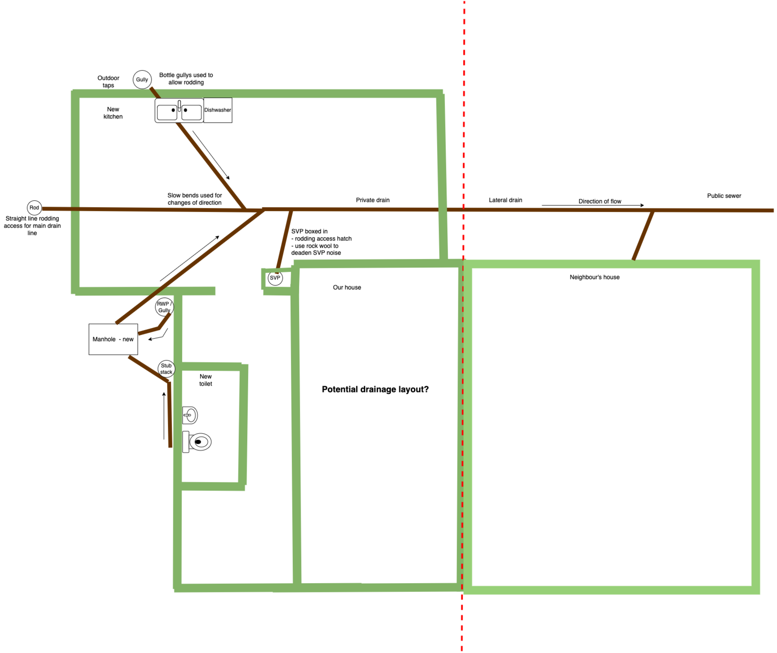 We have a private combined drainage system that heads over to our neighbour's house where it becomes public. We want to build a single story extension over our current drainage, and add in a downstairs toilet.