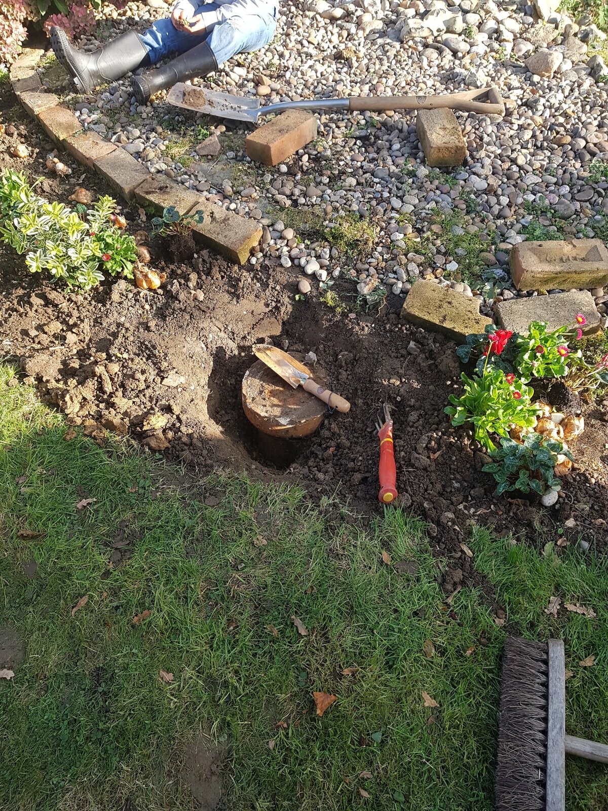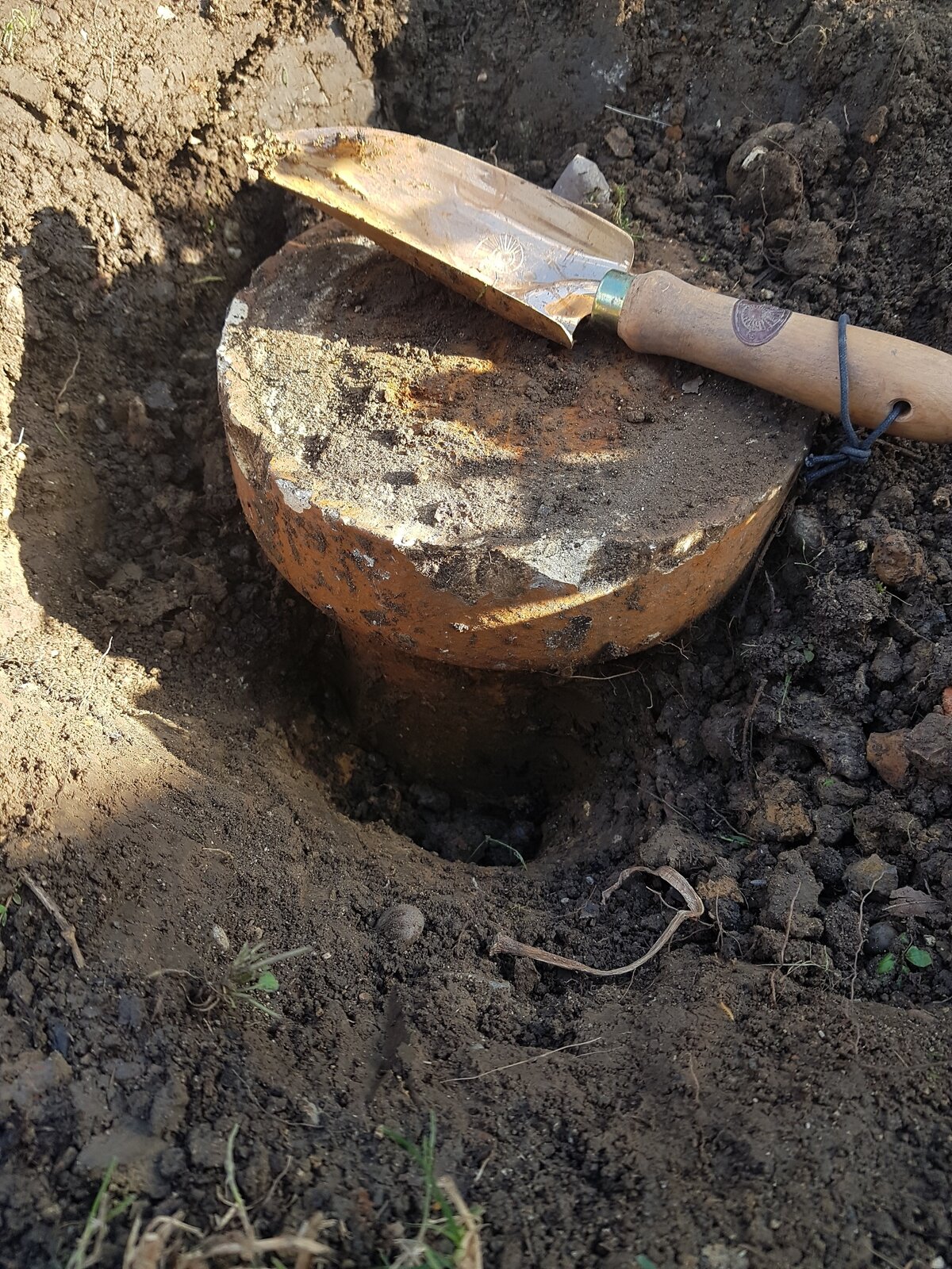 Anyone have any idea what this thing is. I found it about 4" below the surface of the soil. It wobbles but I gave up trying to dig it out of the heavy clay soil once I was a spade depth deep. It is some kind of drain?