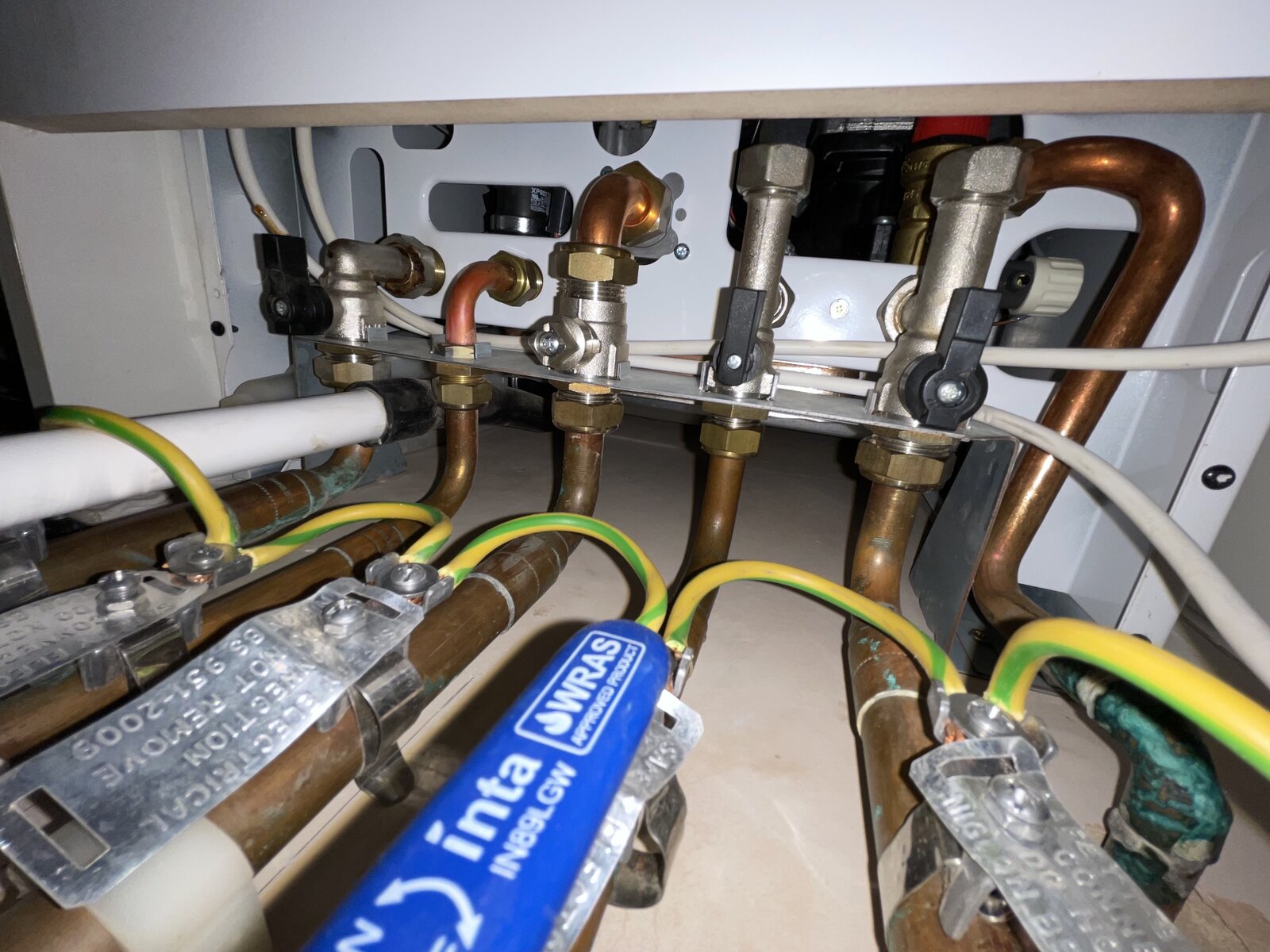 Basically I've got an E119 error on an Eco Elite 30 boiler but I can't find the repressurisation loop – i can see the two adjacent black taps on the right of the image but nothing happens when I turn them together, suggesting a third valve needs to be turned, but I'm not sure which. Please see photo – if anyone knows what needs to be turned I'd much appreciate it! House getting cold.