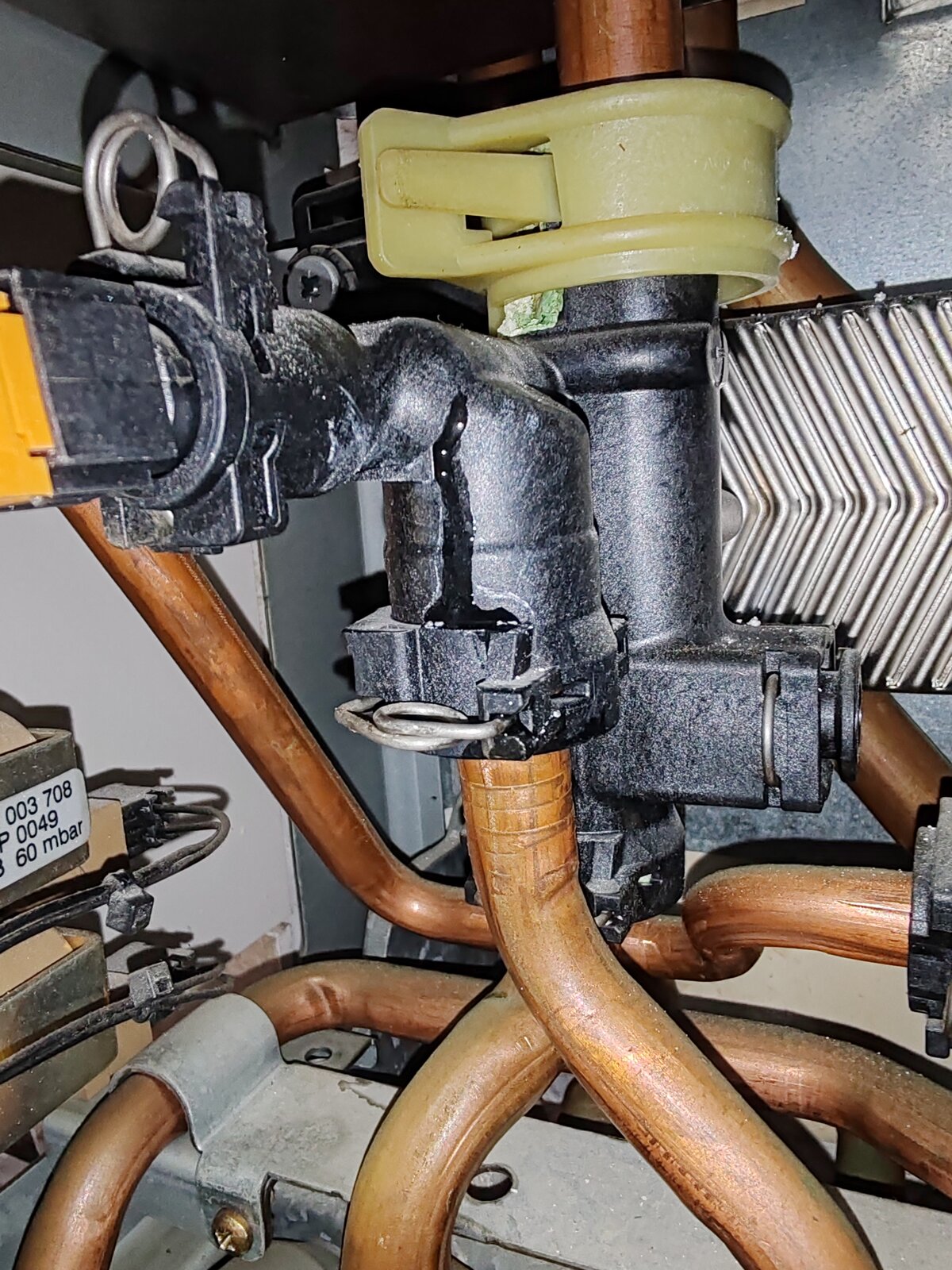 Nothing unusual about that part leaking, quite common. Usually because the boiler has been installed without a shock arrestor. Relatively easy job. Might be a good idea to do the right hand block too, with a new flow adaptor and silencers.