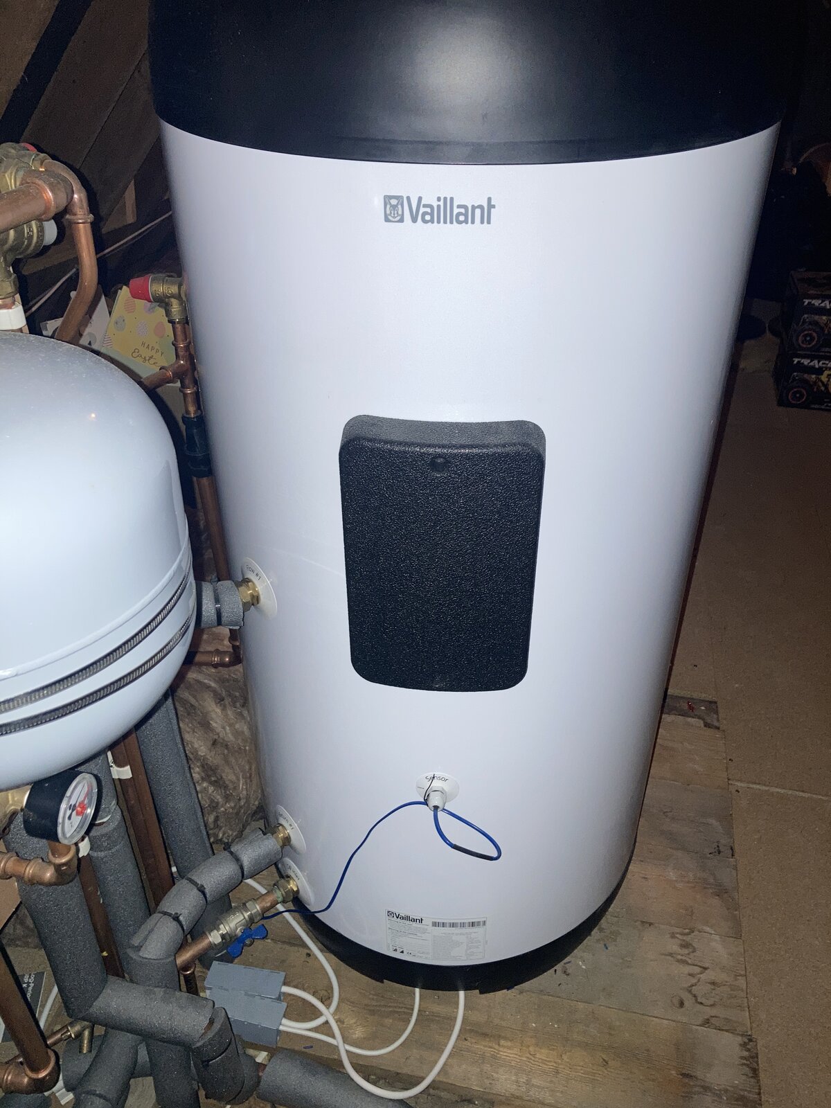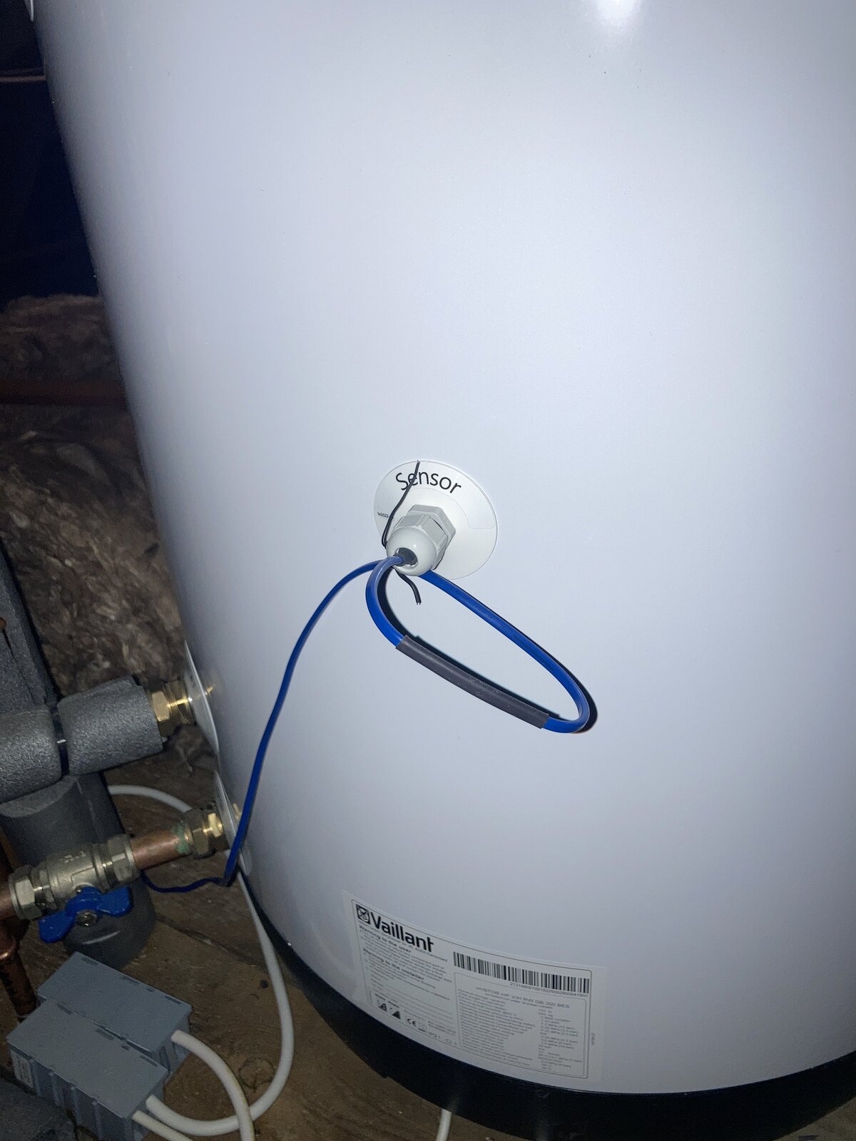 We have a Vaillant unistor unvented 200l HW cylinder with a temperature sensor installed as per photos. This in turn is wired to our ASHP and via the controls we can obviously see what temperature the cylinder is currently at on the display.