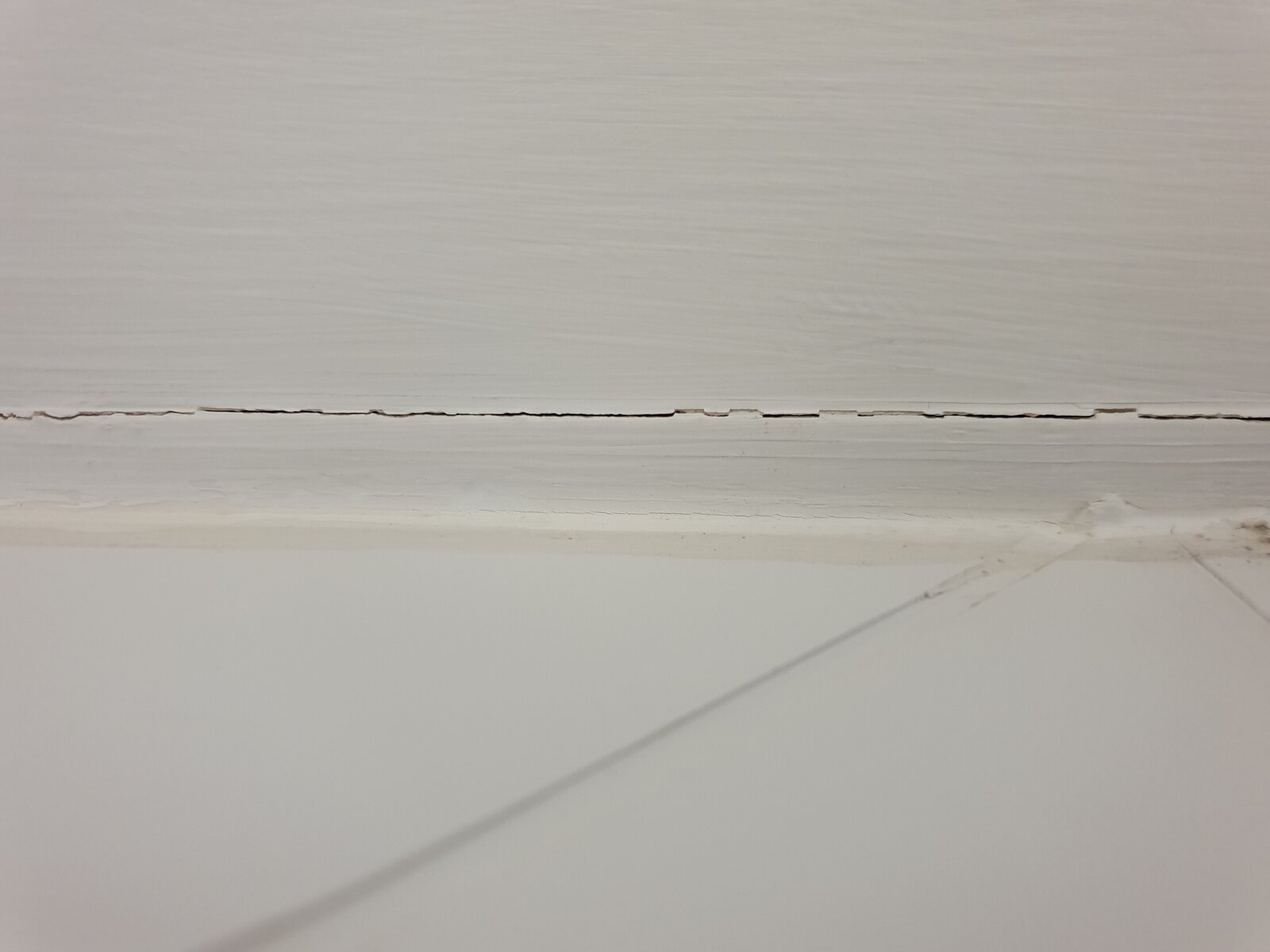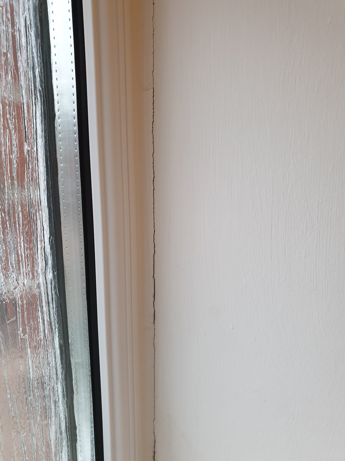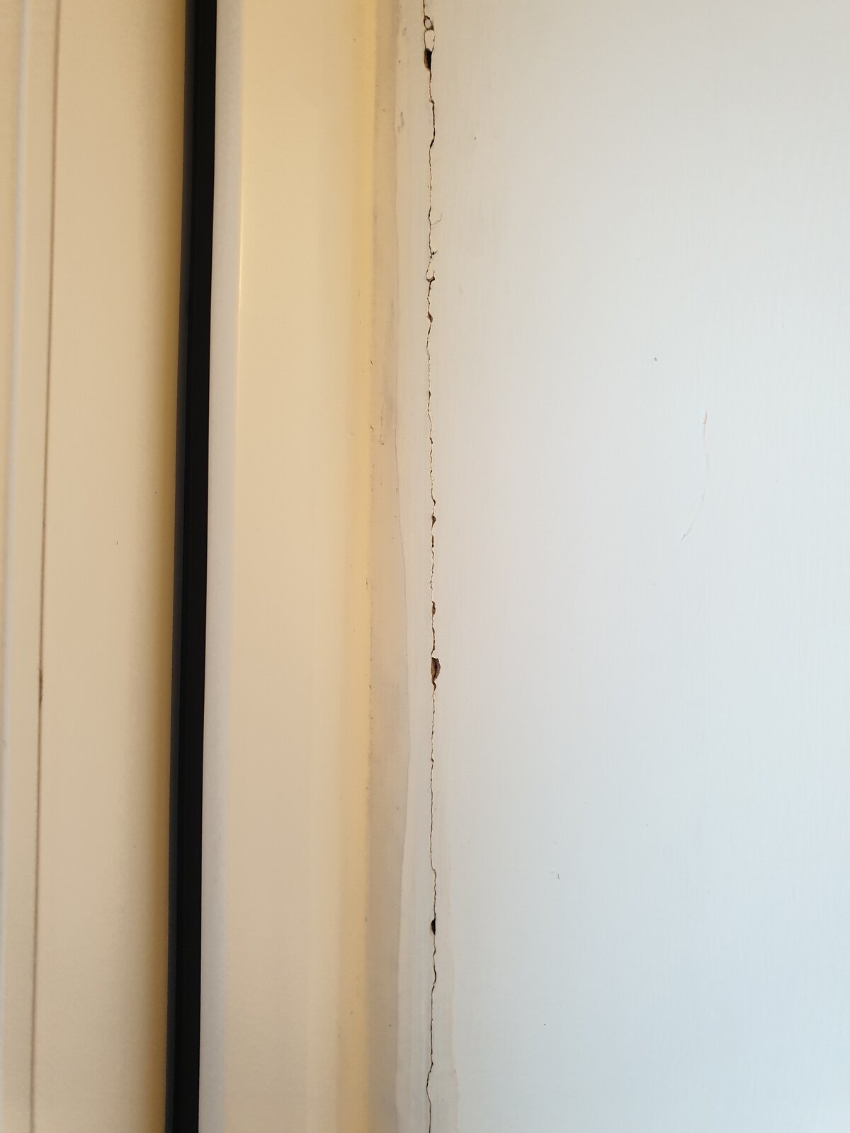 I've noticed that the french doors in the kitchen and the window in the bathroom have some cracks running around it. It's not on the immediate join between the wall and the door/window, it's about 10mm in from the door/window. If I apply some pressure to either the door/window, the crack does increase by a mm, so it is very slightly flexible.