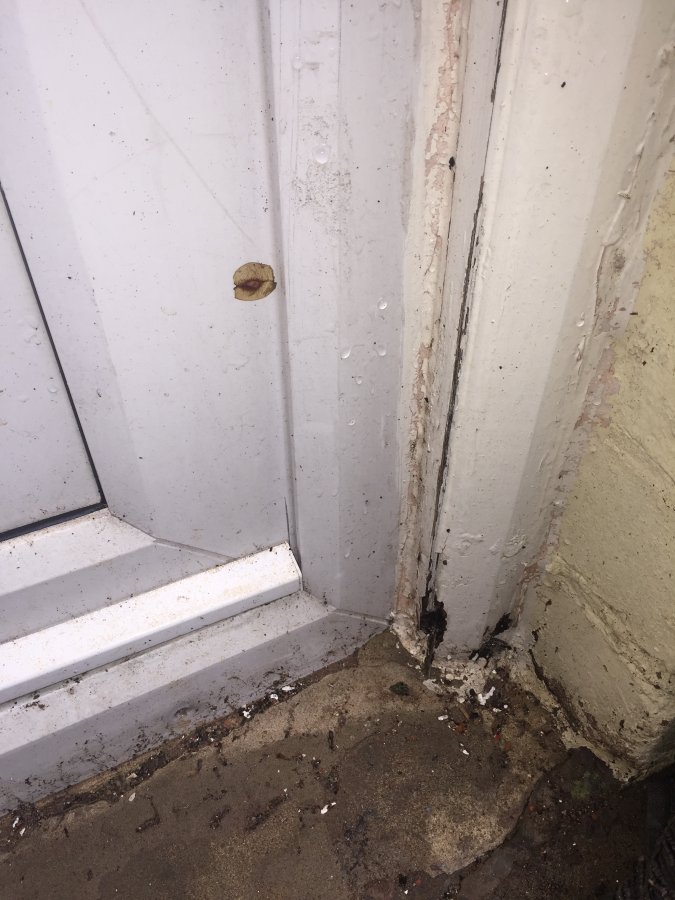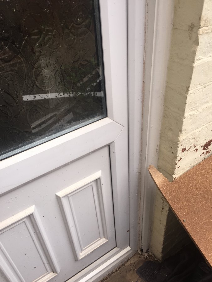 the back door has been fitted to some timber, which I believe was part of the old wooden door frame.