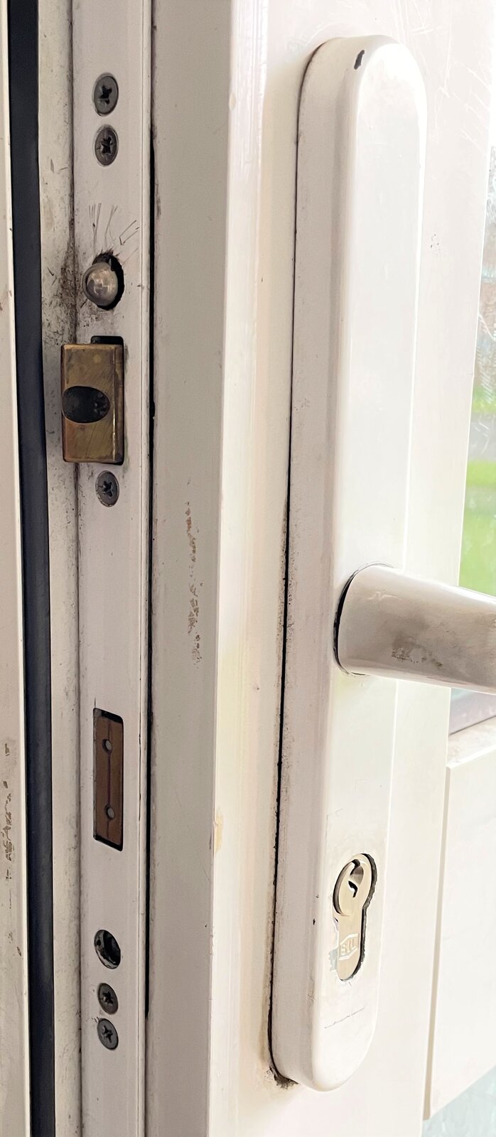 The handle works fine (pushing down) when the door is unlocked. To lock the door the small 'nipple' towards the top of the gearbox needs to be pushed in a mm or two, which allows me to rotate the handle upwards and engage the bolts. Once I turn the key, it sometimes unlocks straight away. Other times it could be upto 10 minutes of fiddling around, using a bit of force to turn the key, toget the door to unlock again. It does this if I just engage the bolts when the door is still open; so, it doesn't seem to be anything related to the door frame.