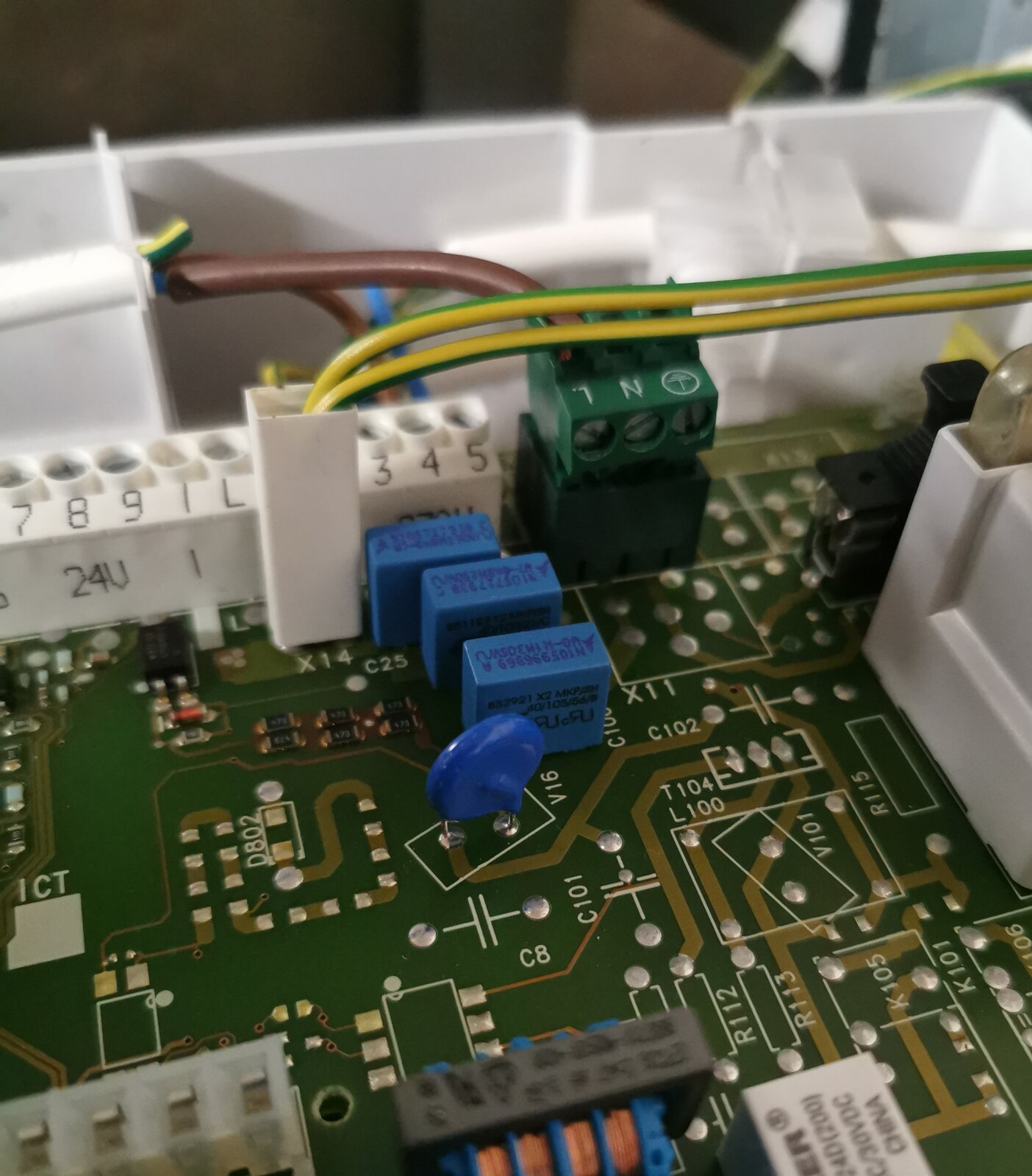 I'm probing the sleeved brown going into the green block. It's hard to see in the pic but it does have a brown sleeve on the blue indicating it's a switched live.