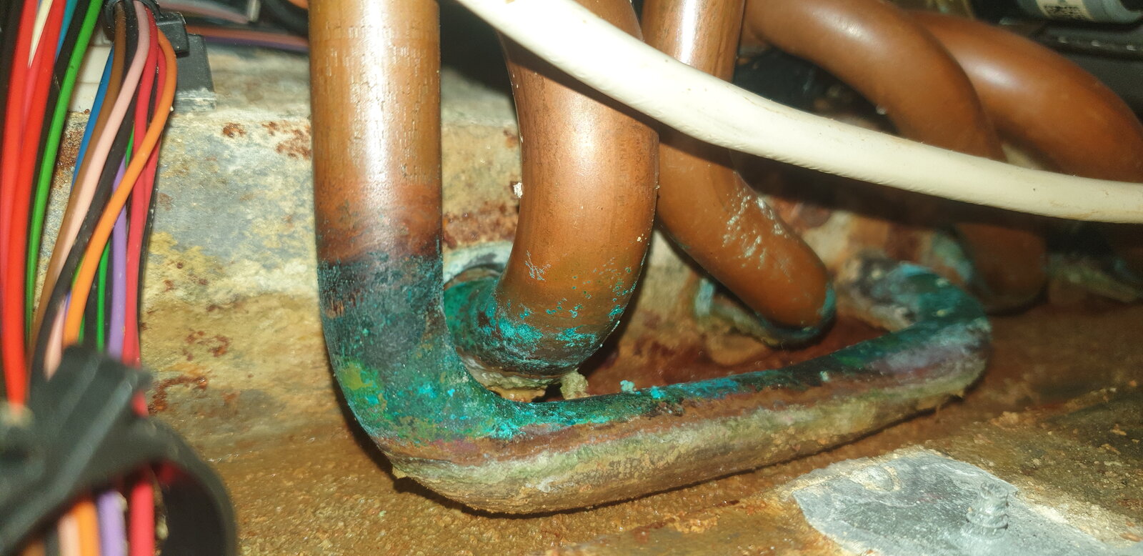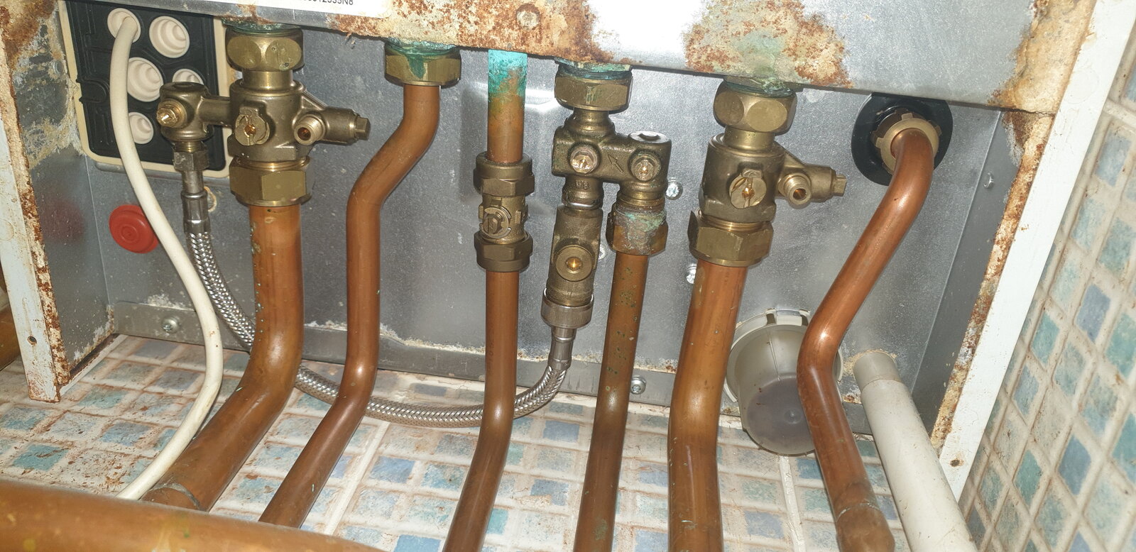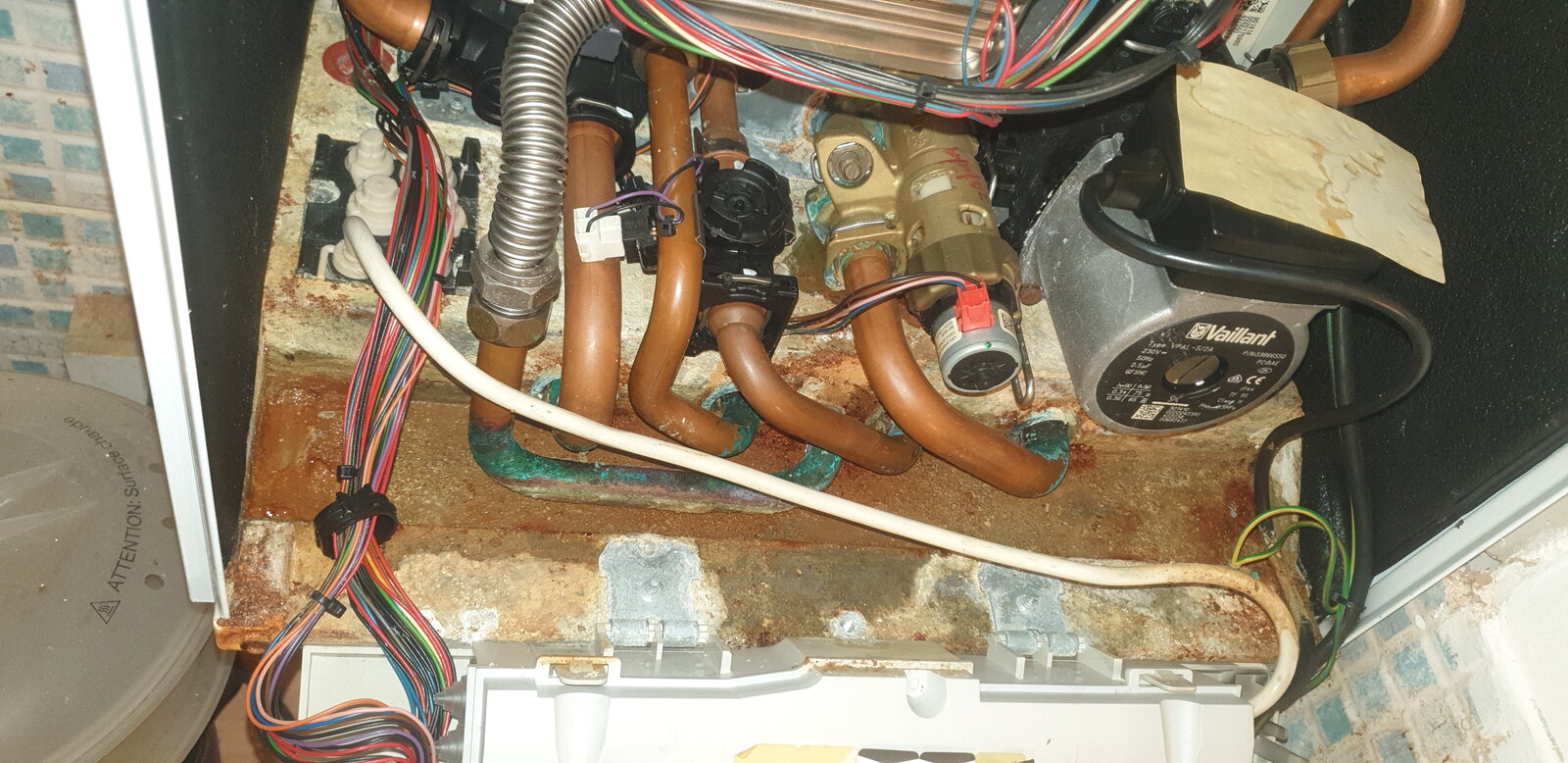 I removed the boiler cover and found signs of leak at the lowest point in boiler enclosure around the inlet connections.