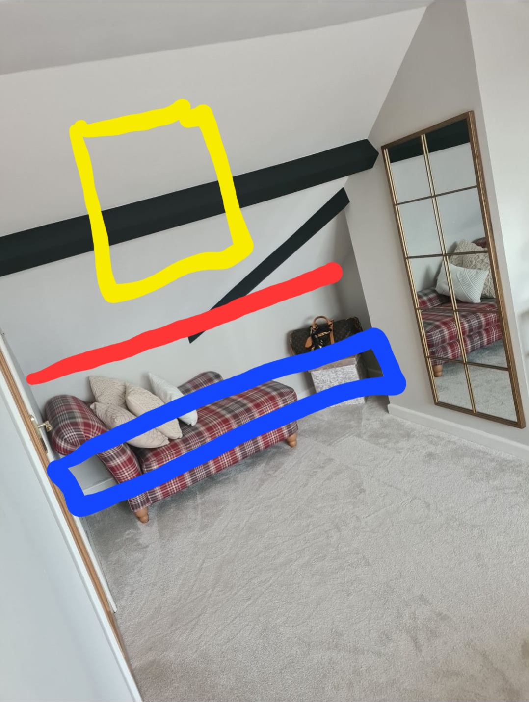 I want to install a velux in the dromer bedroom (coverted bungalow) but the purlin is in the way. There is a purlin already hidden lower down (marked in red) and then the visible purlin painted black. Any suggestions on what to.do, below the purlin would be to low and above is not a big enough space.