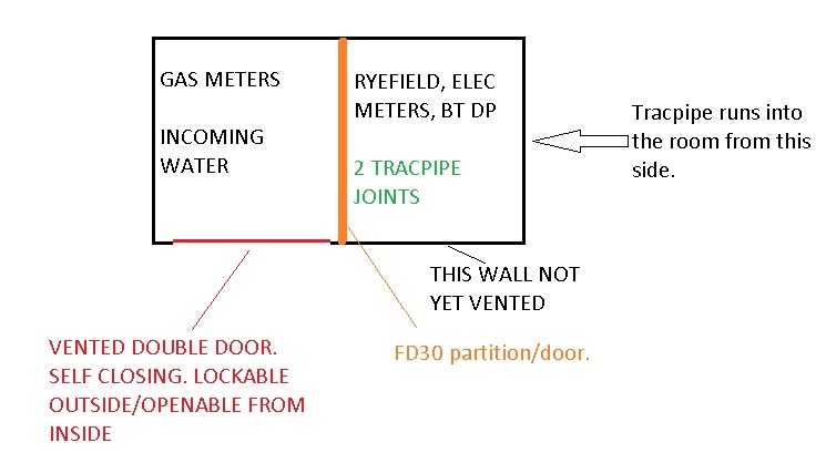 The meter room is split in half with electric meters on the right and gas meters on the left. The electric and gas are separated by a FD30 door and partition. The Tracpipe all comes into the room from the electric side (see attached picture).