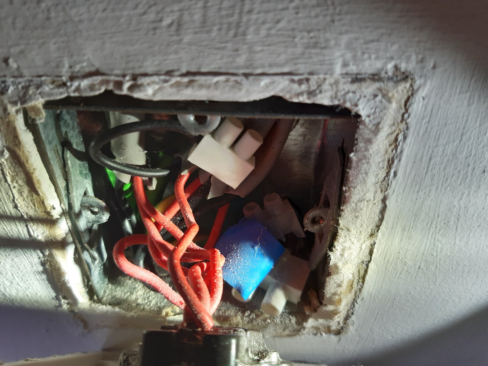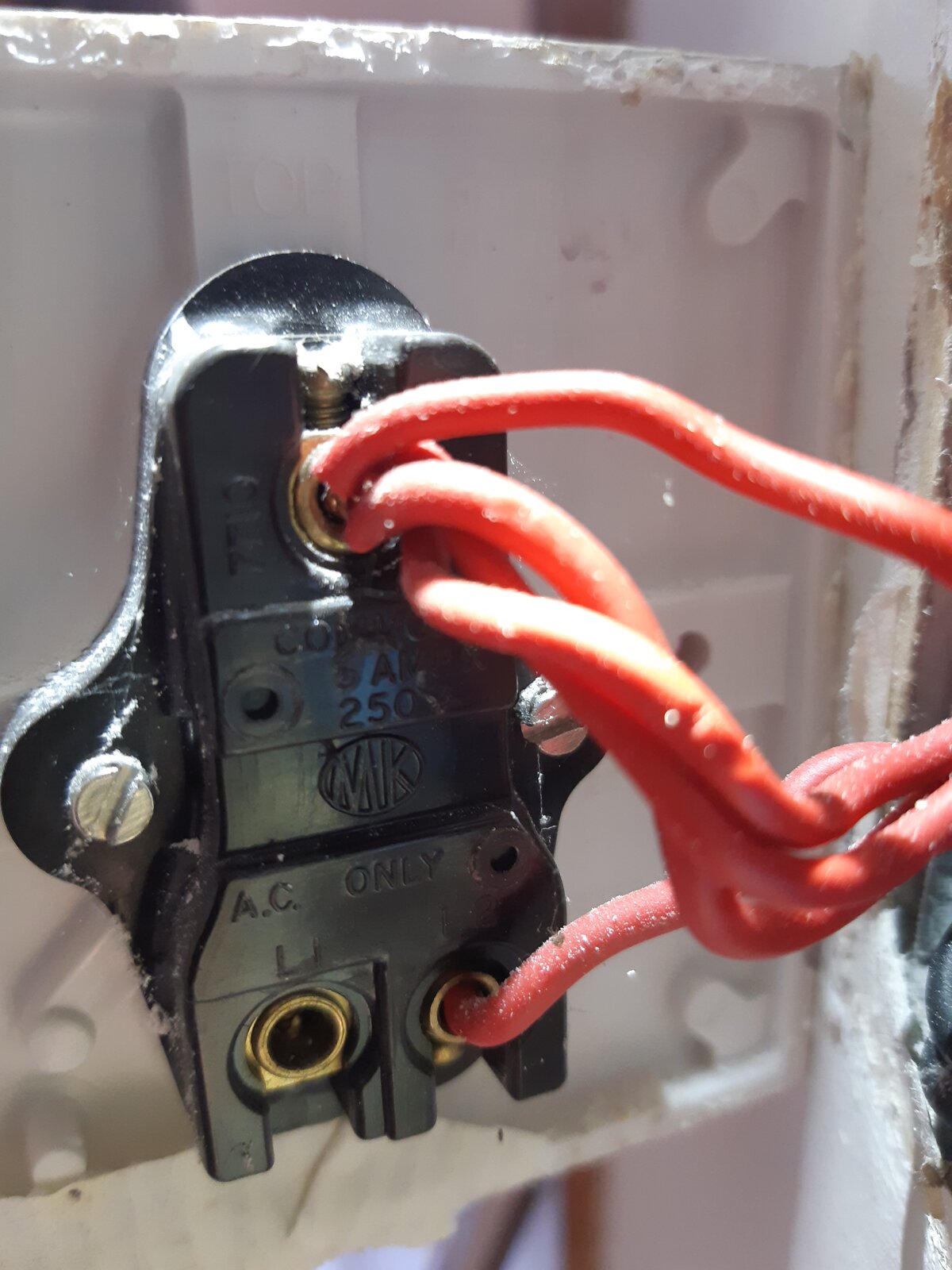 As you can see from the photo, the solitary red wire goes into L2 and the 4 bunched red wires are all squeezed into the connector at the top. I'm trying to fit a modern 1 gang switch with 4 connectors: Com, 1 Way, Loop and 2 Way. Can anyone suggest which ones I connect to in the new switch? I assume it will be the same idea, the 4 bunched reds into one and the single red into another but which ones?